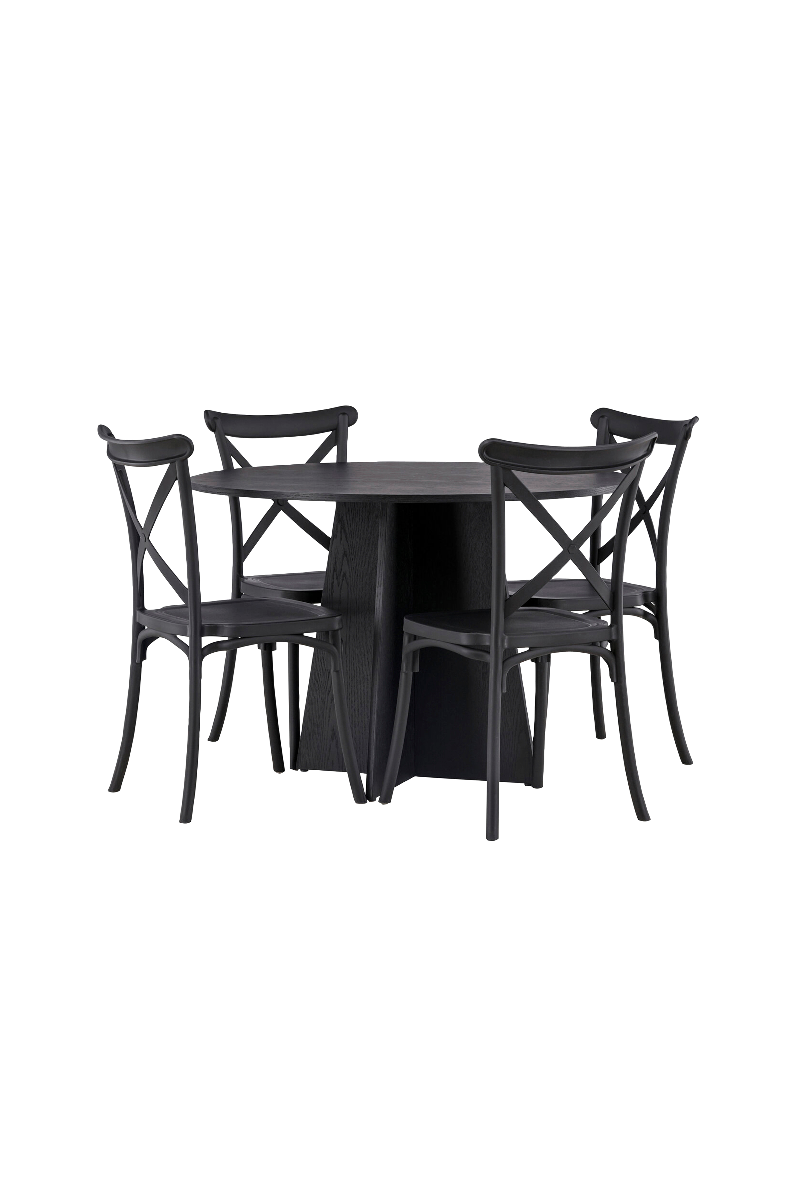 En luksuriøs spisegruppe! Det runde spisebordet Bootcut i gjennomgående farge har en bordplate i MDF med finér og en designrik stamme som gir et lekkert helhetlig inntrykk. Her sammen med spisestoler fra serien Crosett. Stolen er gjennomgående produsert i det praktiske materialet plast, og har en matt farge som tåler tidens tann. En rund spisegruppe passer perfekt for å skape en sosial og innbydende stemning i rommet! Bordets mål: 110 cm.