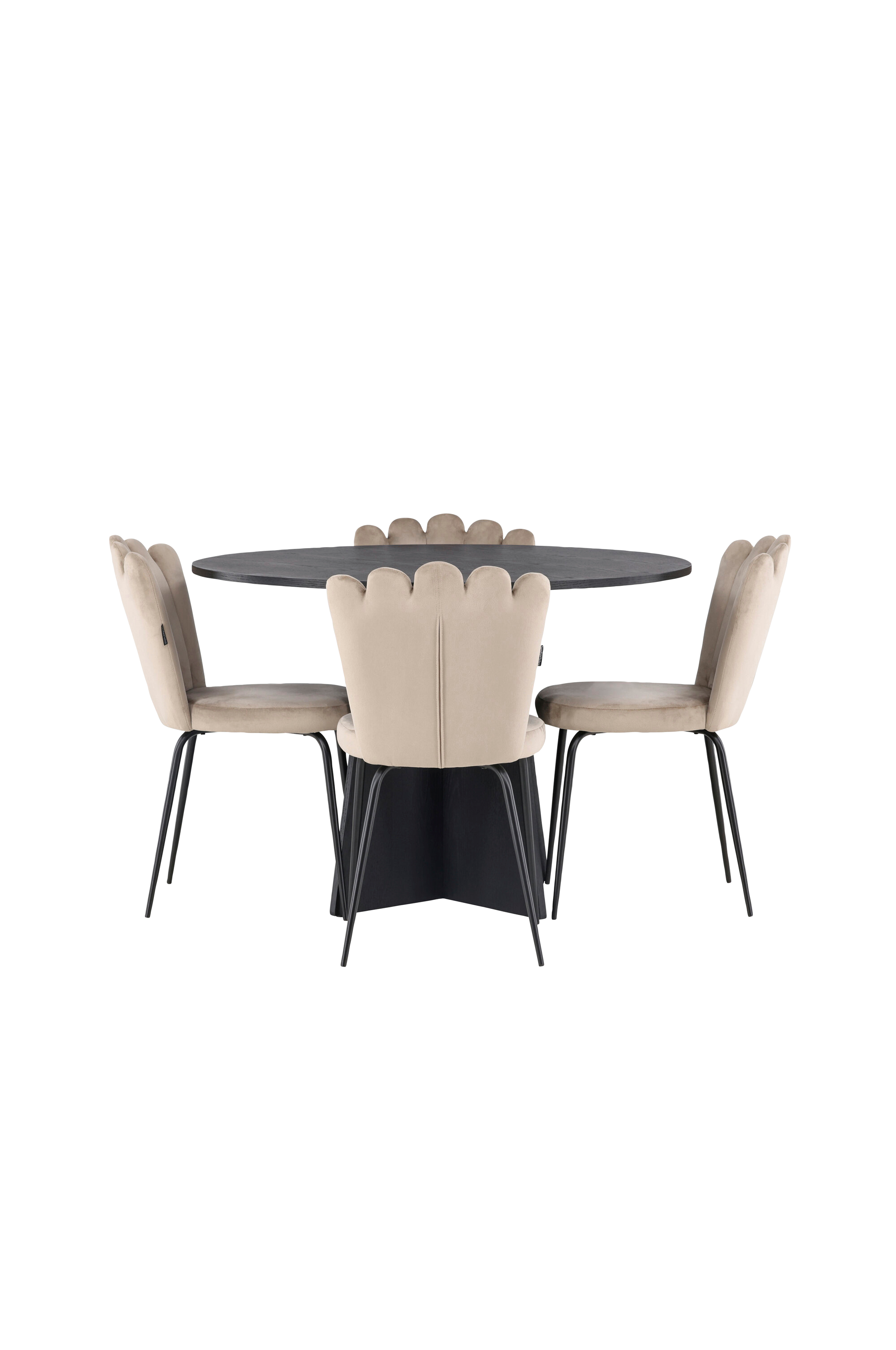 Skap et luksuriøst og innbydende blikkfang! Det runde spisebordet Bootcut i gjennomgående farge har en bordplate i MDF med finér og en designrik stamme som gir et lekkert helhetlig inntrykk. Her sammen med de populære spisestolene Limhamn. Stolen har en innbydende design med dekorativ skjellformet rygg med dekorsømmer og rundt sete i smakfullt fløyelsstoff. Bena er i pulverlakkert metall. Like smart som iøynefallende, rett og slett! Bordets mål: 110 cm.