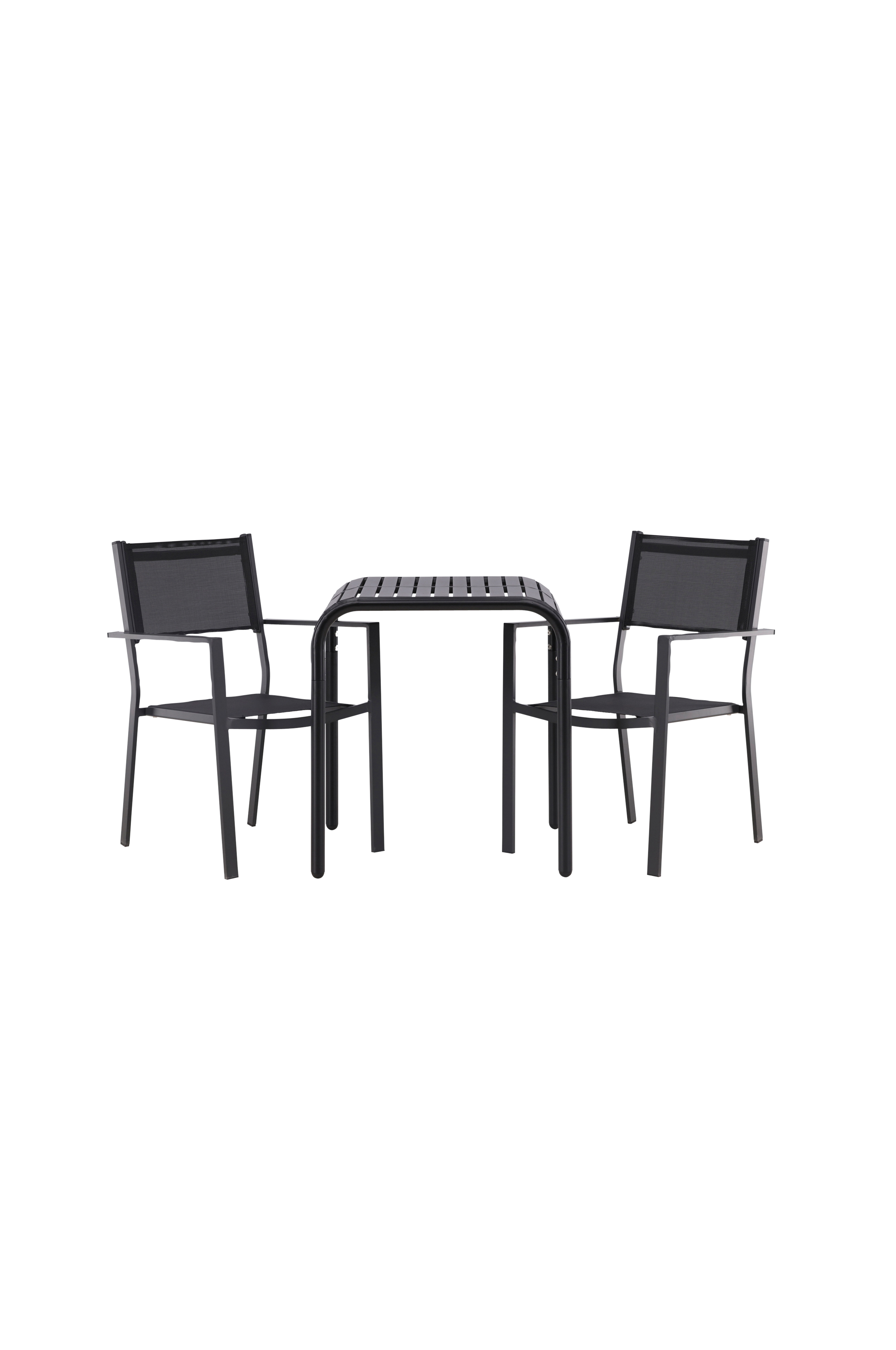 Perfekt kafegruppe til den lille balkongen eller uteområdet! Bordet fra serien Borneo har smidige former og tidløs skandinavisk design. Bordplaten er ribbet og bølger ned langs kantene ved bena. Gjennomgående produsert i aluminium, noe som gir deg et slitesterkt bord som er enkelt å flytte rundt. Her i pen kombinasjon med 2 stk spisestoler fra serien Copacabana. Stolene har rette nordiske former og er stabelbare. Setet er i tekstil og stolbena i aluminium. Dekk på til lunsj i sommer, og nyt hyggelige stunder!