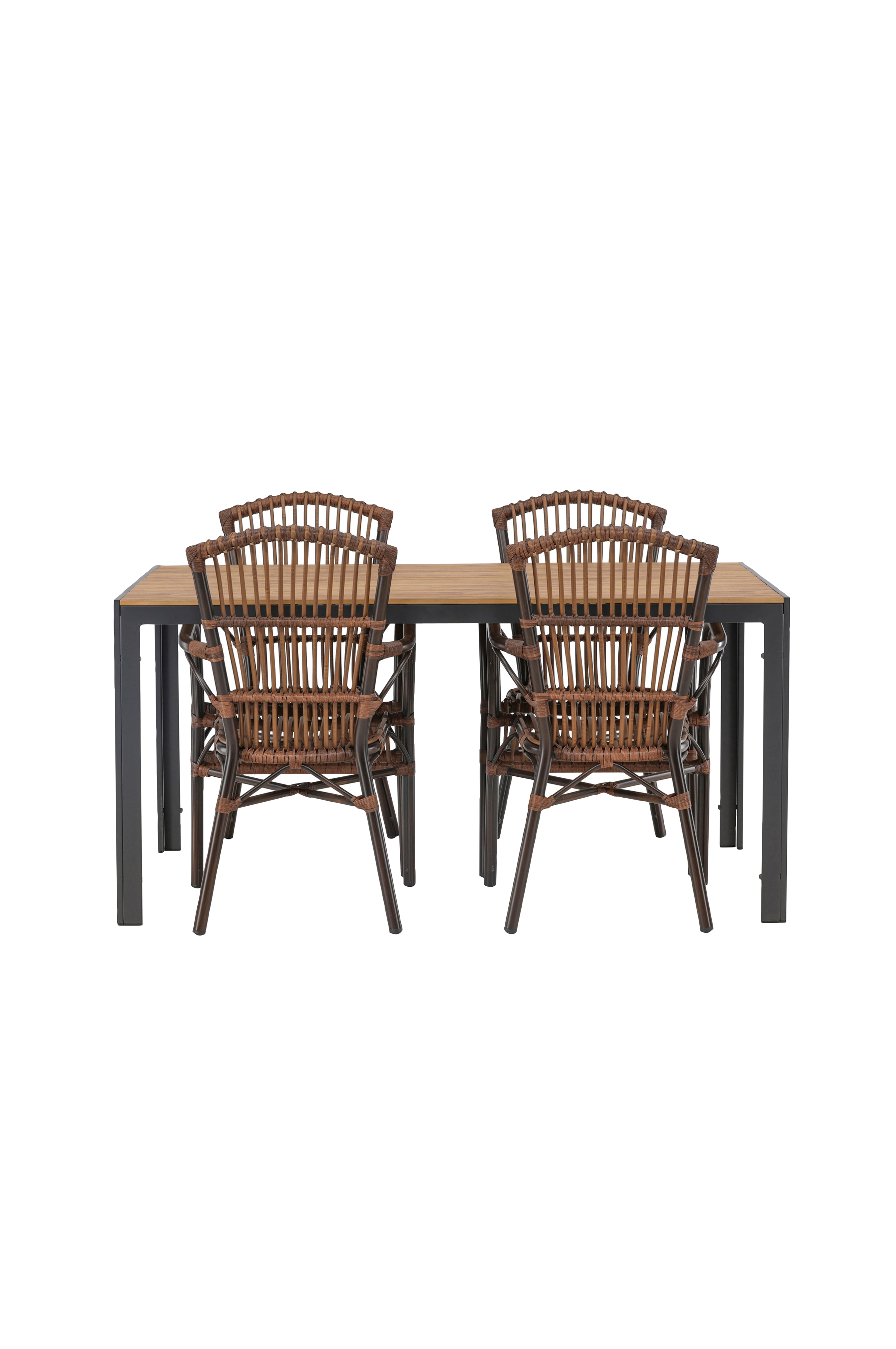 Denne spisegruppen imponerer med sitt trendy blikkfang og høye komfort! Det rektangulære spisebordet Break har rette former i klassisk nordisk design med bordplate i kryssfiner og bordben i aluminium. Her sammen med 4 stk av de populære spisestolene fra serien Galera. Stolen har en moderne farge i valnøtt og smakfull utførelse i flettet kurvmateriale. Rammen i aluminium er robust med høye armlener for ekstra komfort og herlig sittedybde som gjør at du sitter behagelig lenge. Nyt herlige måltider i sommer!
