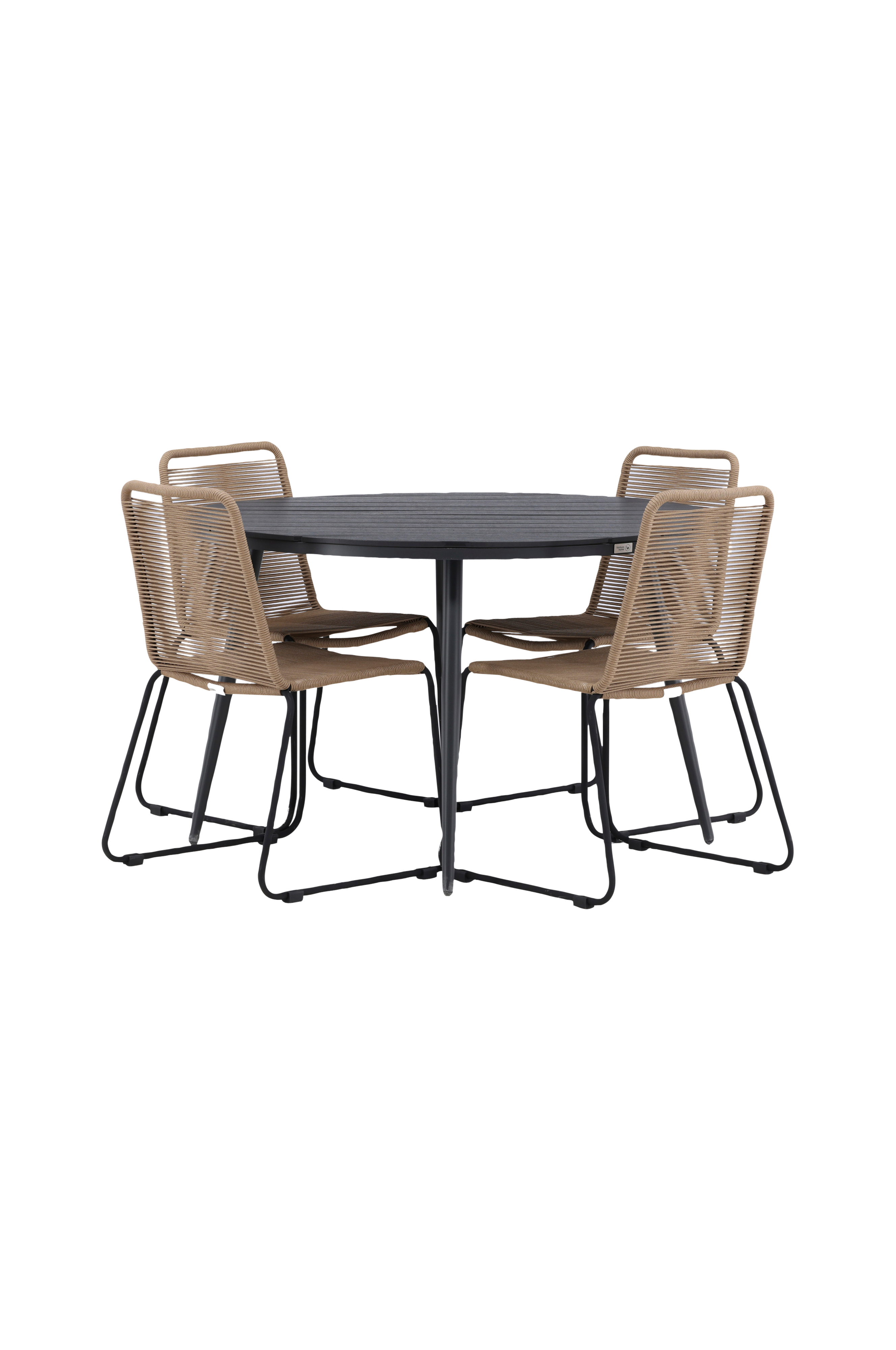 Her får alle plass og ingen havner på kanten - en rund spisegruppe passer utmerket for hyggelige, sosiale stunder! Spisebord Break har rund bordplate i aintwood og klassisk understell i aluminium. Her sammen med trendy spisestoler fra serien Lindos i motebevisst design. Stolene har stilrene smale ben i aluminium og sete i slitesterkt tau. Møbler uteområdet innbydende, og skap et blikkfang som imponerer!