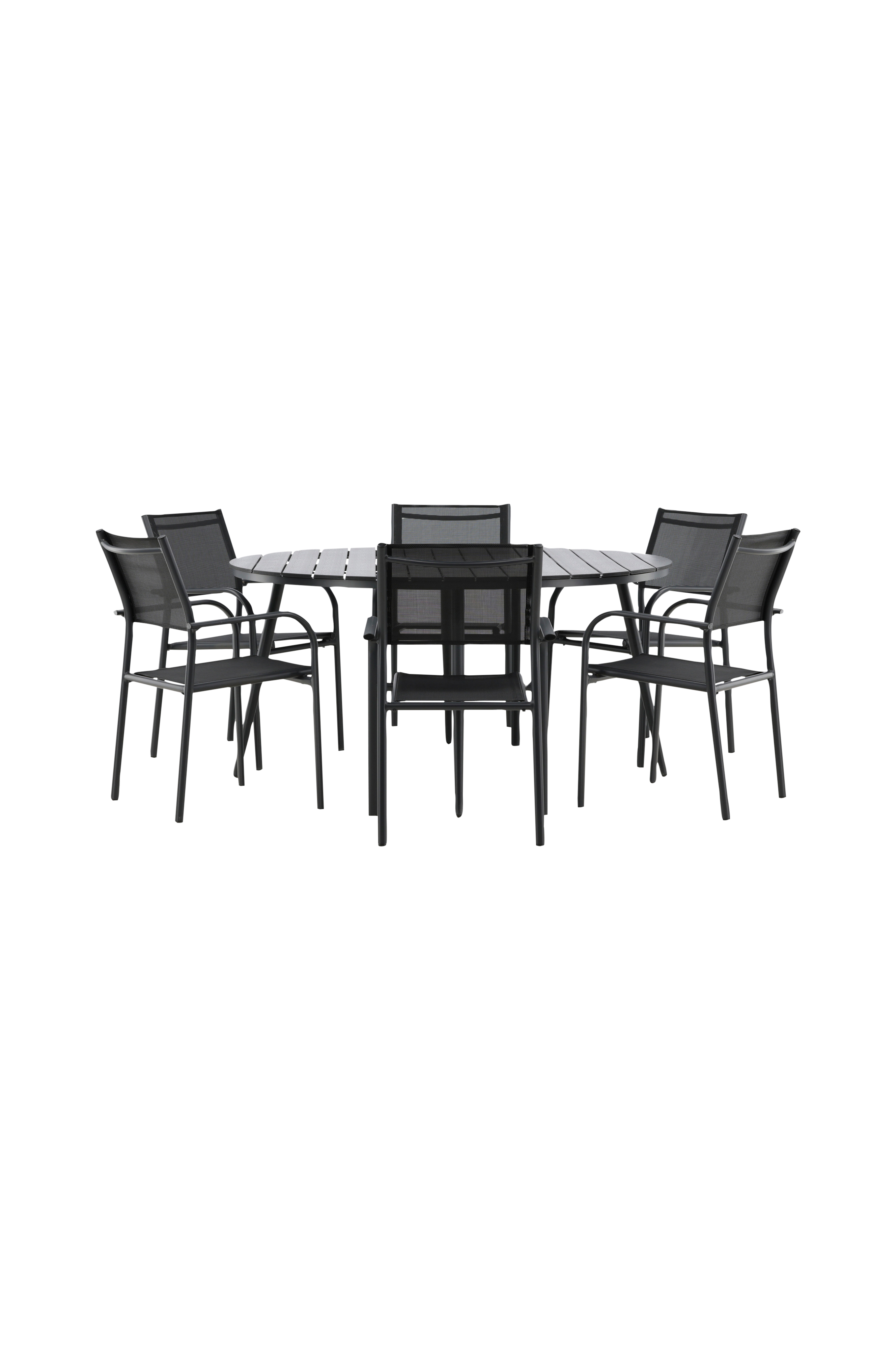Lekker matchende spisegruppe i stilig farge som har plass til mange - her havner ingen på kanten! Spisebordet Break har bordplate i aintwood og klassisk understell i aluminium. Her i perfekt kombinasjon med spisestoler fra serien Santorini. Stolene har integrerte armlener i aluminium og sete i Textilene. La tiden her bli dagens høydepunkt!