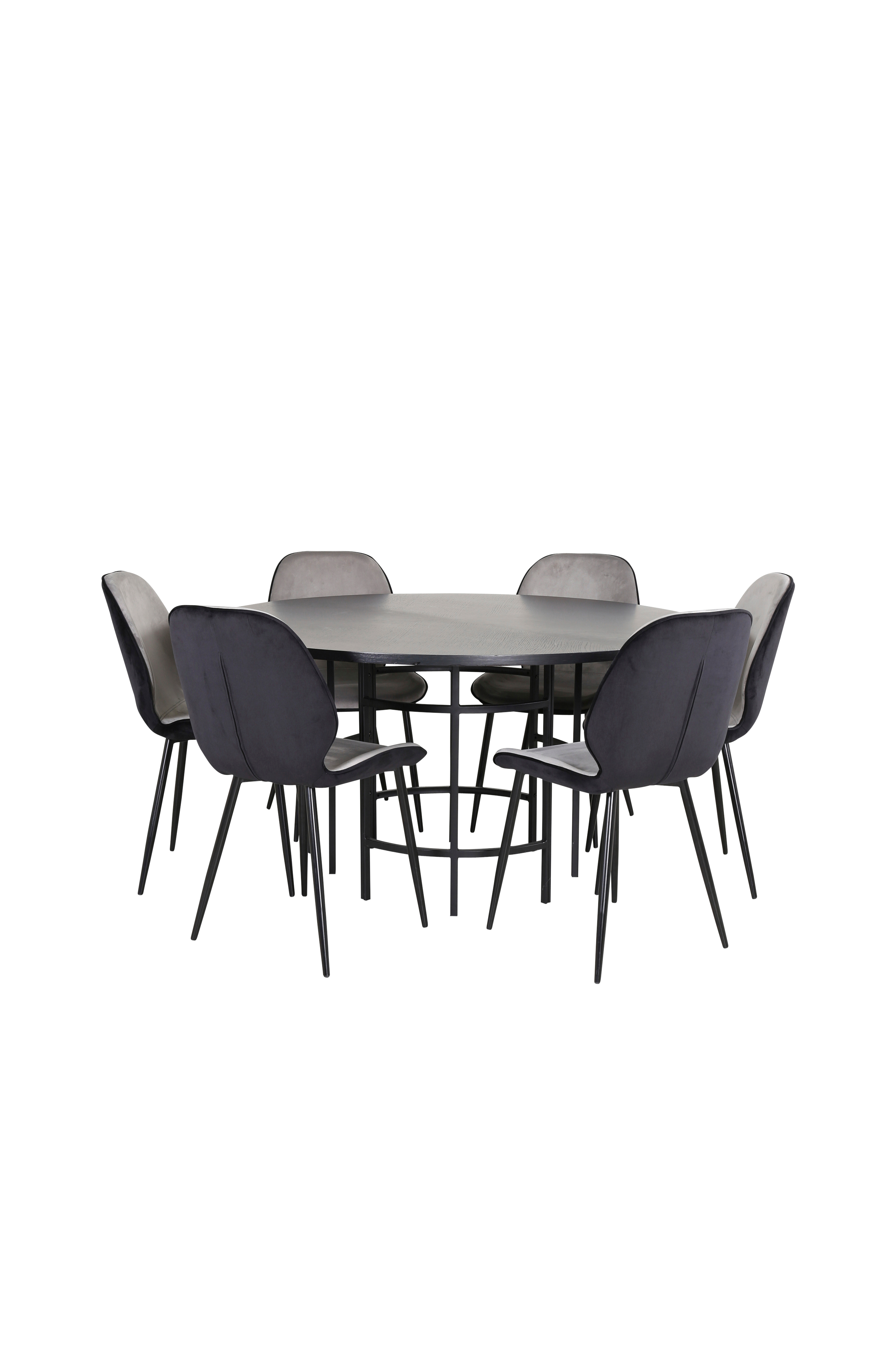 Copenhagen spisebord med rund bordplate i MDF med finér og bordben i metall. Matches med 6 Emma spisestoler med sete i fløyel og stolben i jern. Bord og stol krever enkel montering. Bordets mål: Diameter: 140 cm. Høyde: 74 cm. Stolens mål: Sittedybde: 40 cm. Sittebredde: 47 cm. Sittehøyde: 45 cm.