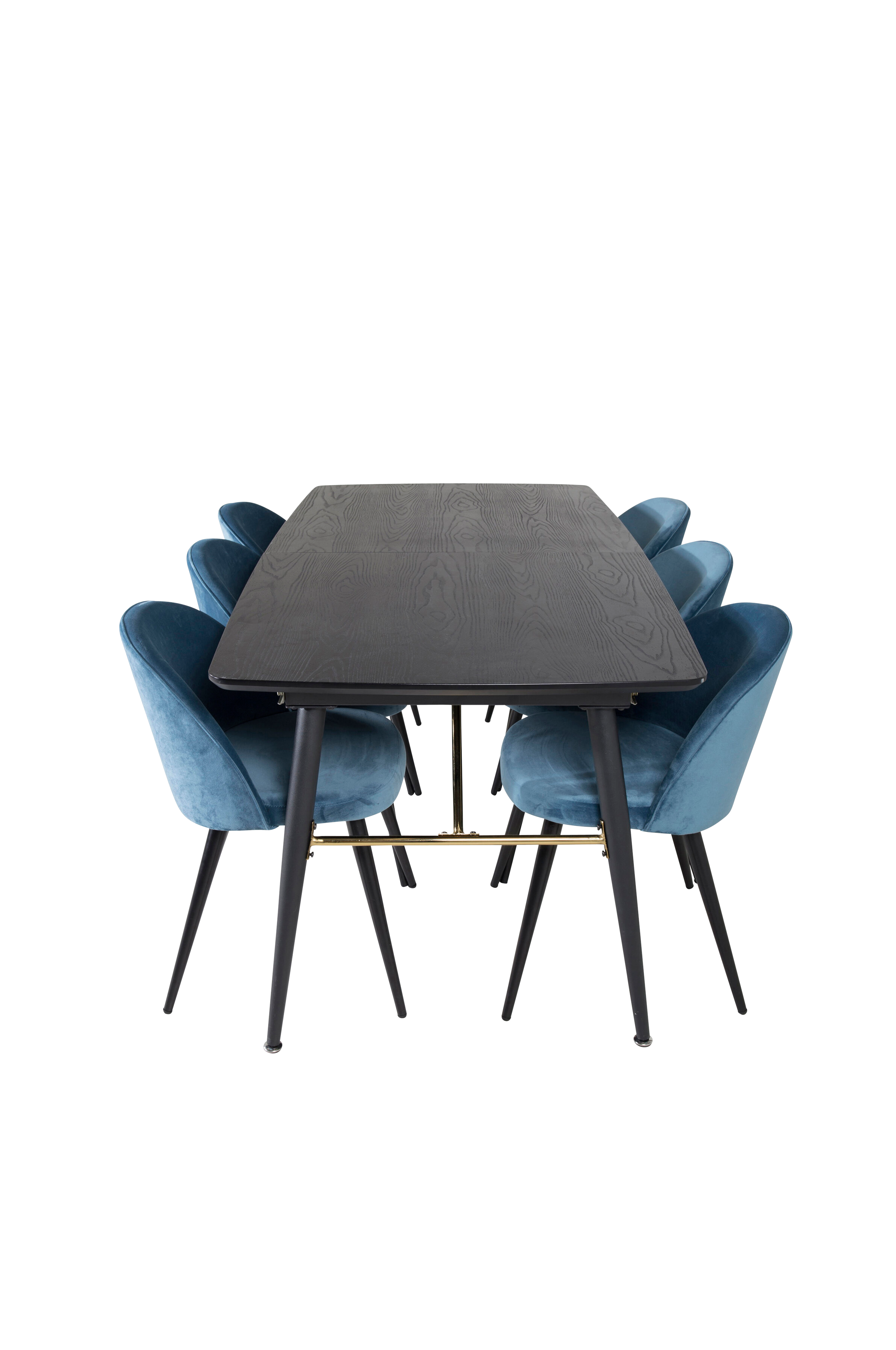 Frisk opp blikkfanget i stua med en spisegruppe i smakfull design! Spisebordet Gold kan utvides og har plass for alle nære og kjære ved behov. Bordplaten i stilig farge er laget av MDF og har en diskret tre-look. Bordbena er moderne utsvingte i metall og skaper et solid inntrykk. Her sammen med de populære spisestolene Velvet i en gledesspredende farge. Stolen har helkledd design med ben i pulverlakkert metall samt rygg og sete med myk polstring i fløyel. Våg å skille deg ut og sett et personlig preg på innredningen!