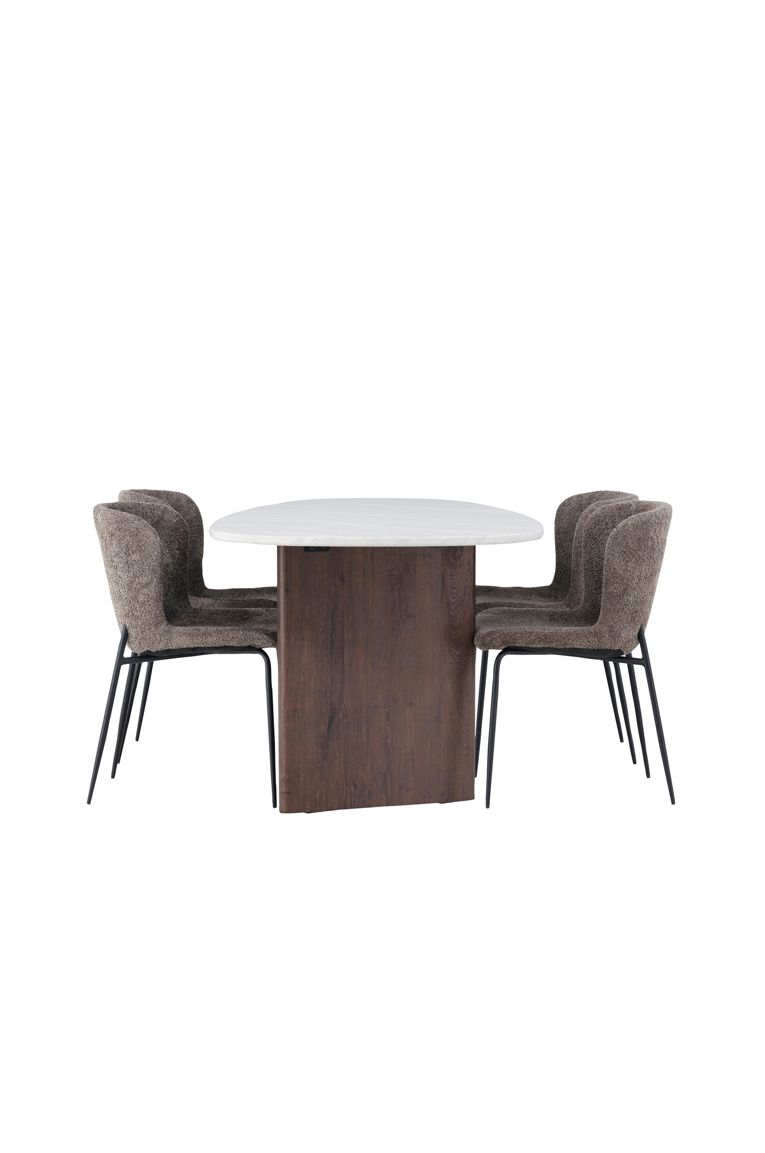 Det herlige, ovale spisebordet Grönvik har en uregelmessig bordplate i MDF med betong-look som gir en moderne touch til hjemmets hjerte. Bordplaten bæres av to tynne treplater i en moderne trendy farge som utstråler sjarm og ro. Her sammen med spisestoler fra serien Modesto med perfekt balanse mellom komfort og stil. Stolen, kledd i sotet, loddent stoff, har en stilren følelse og trendy design som er helt i tråd med de nordiske formene. De stilrene, smale stolbena i metall gir et moderne uttrykk som kompletterer Grönvik-bordets design på en enestående måte.