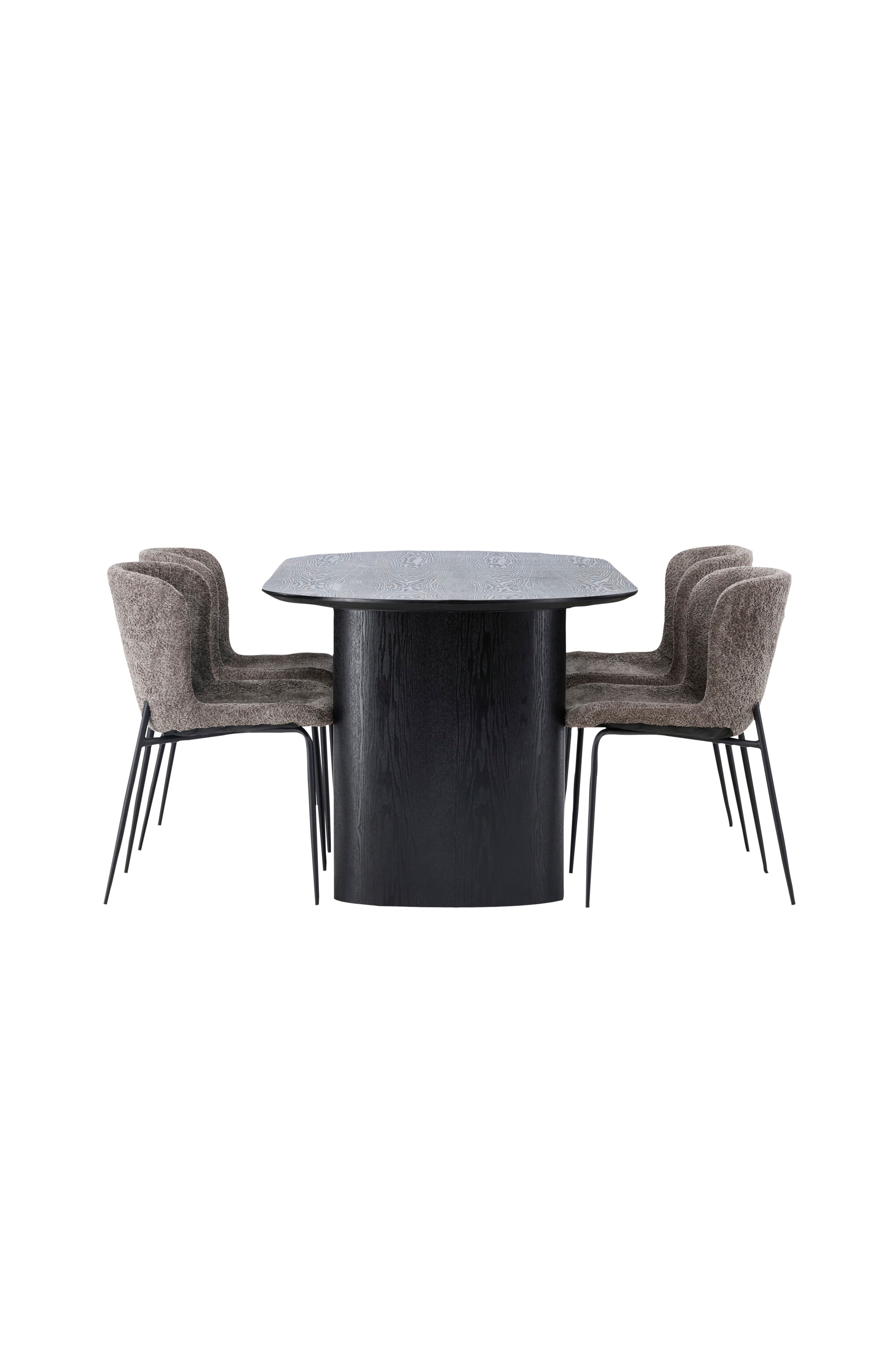 Sitt behagelig og møbler moderne! Det ovale spisebordet Isolde i stilig farge har en moderne utforming med oval bordplate i MDF og robust stamme som gir et stødig inntrykk. Det levende materialet gir smakfull bevegelse til blikkfanget. Her sammen med motebevisste spisestoler fra serien Modesto. Stolen er helkledd i loddent stoff med stilrent smale stolben i metall. Den lett avrundede ryggen og polstrede sitteputen gir ekstra komfort, og forlenger hyggelige måltider rundt spisebordet.