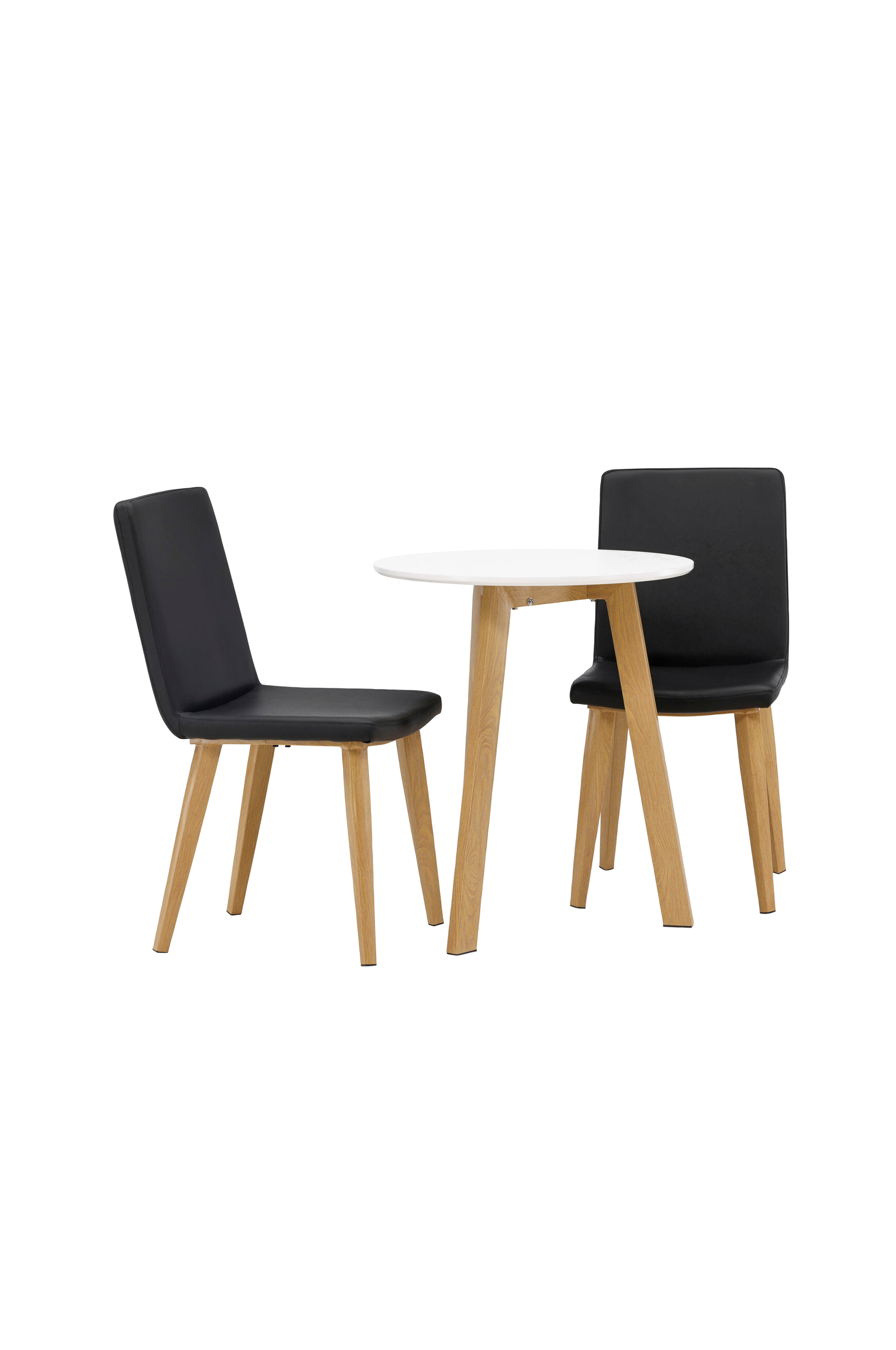 En klassisk spisegruppe for to! Det runde spisebordet Leonora har rund bordplate i MDF og en tre-trebent stamme i lekker look. Her sammen med klassiske spisestoler fra serien Today. Stolene har rette nordiske former og flott helkledd sete i kunstskinn. Stolbena er lett skrånende og gir et solid inntrykk. Perfekt for det lille kjøkkenet!