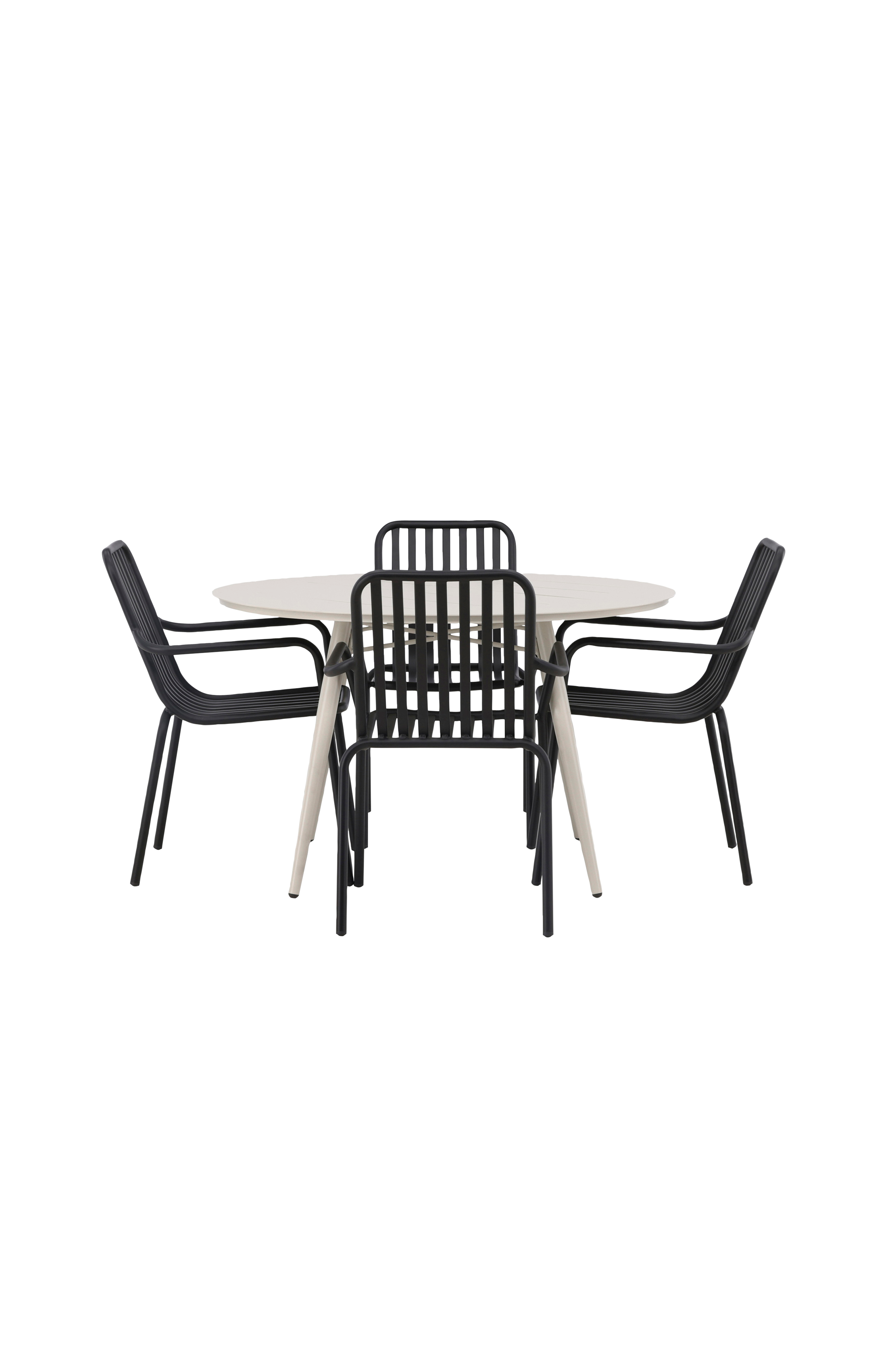 Denne spisegruppen passer like fint i uterommet som på altanen! Det enkle, men elegante, runde spisebordet fra serien Lina har en fresh design og varm farge. Bordplaten er tynn med dekorative sprosser og bordbena lett utsvingte; gjennomgående laget av stål. Her i pen kombinasjon med 4 stk spisestoler fra serien Peking. Stolens ribbede utførelse og sotete farge gjør at den både føles moderne og tidløs. Produsert i aluminium som gjør den enkel å flytte rundt, og integrerte armlener for ekstra komfort. La tiden her bli dagens høydepunkt!
