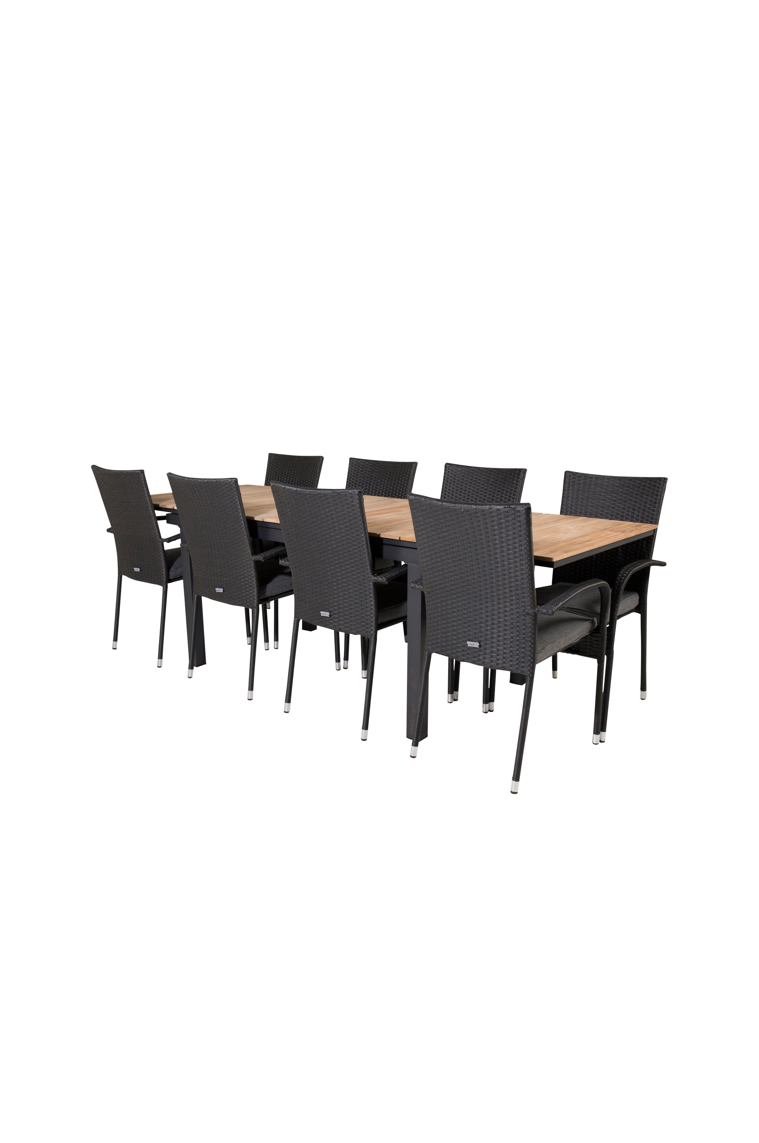 Molle spisebord med bordplate i naturfarget teak og svarte bordbein i aluminium. Mål bord: Lengden kan forlenges mellom: 160cm og 240cm. Bredde: 90 cm. Høyde: 74 cm. Matches med 8 stabelbare Astrid spisestoler i svart kunstrotting med svarte stolben i stål. Mål stol: Totalhøyde: 96 cm. Bredde: 45 cm. Dybde: 47 cm. Sittehøyde: 44 cm. Bord og stol krever enkel montering.