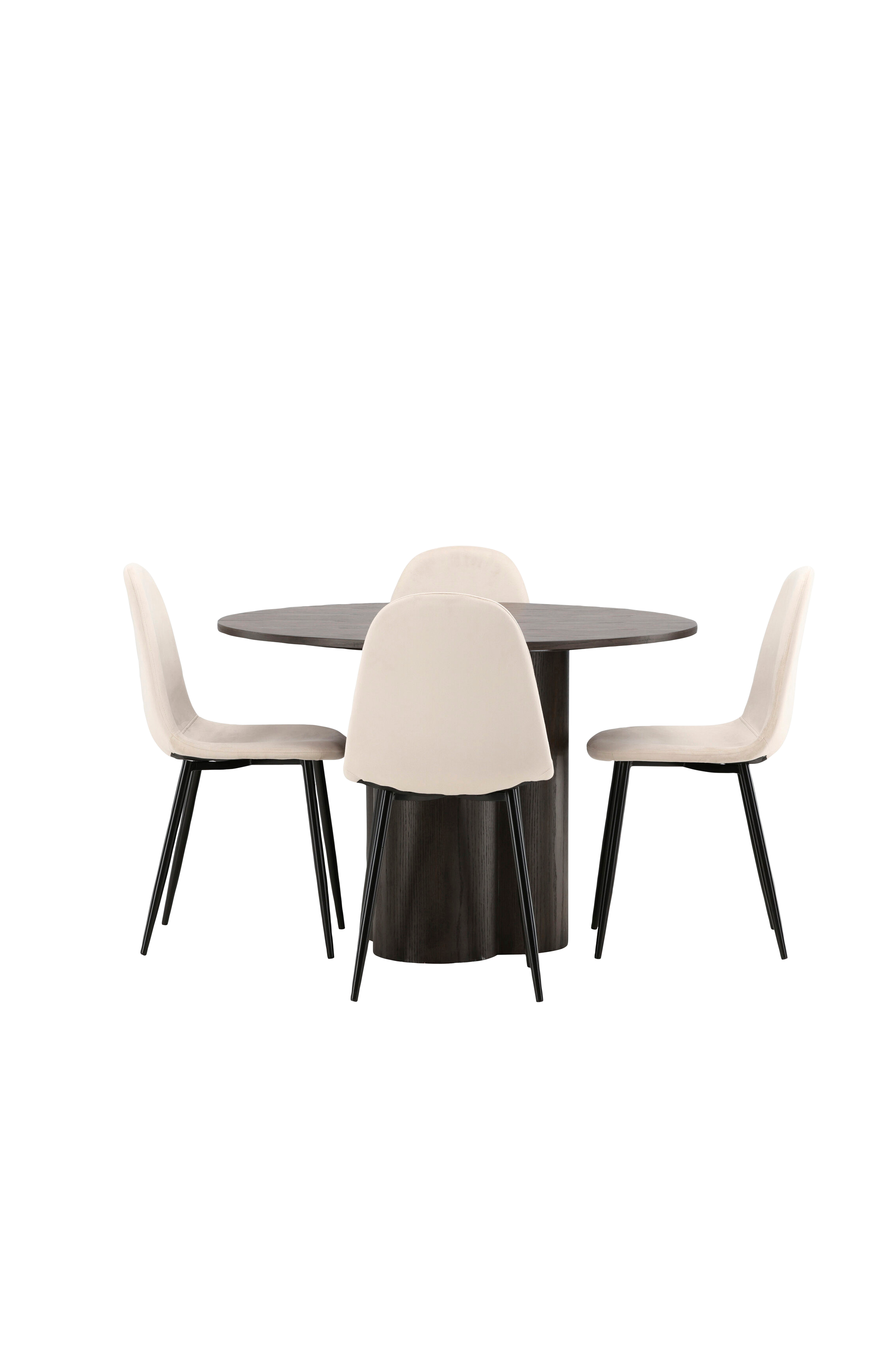 Du trenger ikke å velge mellom stil og komfort! Spisebordet Olivia imponerer med sin skandinaviske design og smakfulle utforming. Bordet kommer i en smakfull farge i MDF med en tynn, rund bordplate og tre sylinderformede ben som sitter samlet midt under bordet. Her i perfekt kombinasjon med stoler fra serien Polar. Stolen har helkledd design med avrundet rygg og sete i fløyelsstoff med myk polstring, og ben i pulverlakkert metall. Nyt hyggelige måltider!