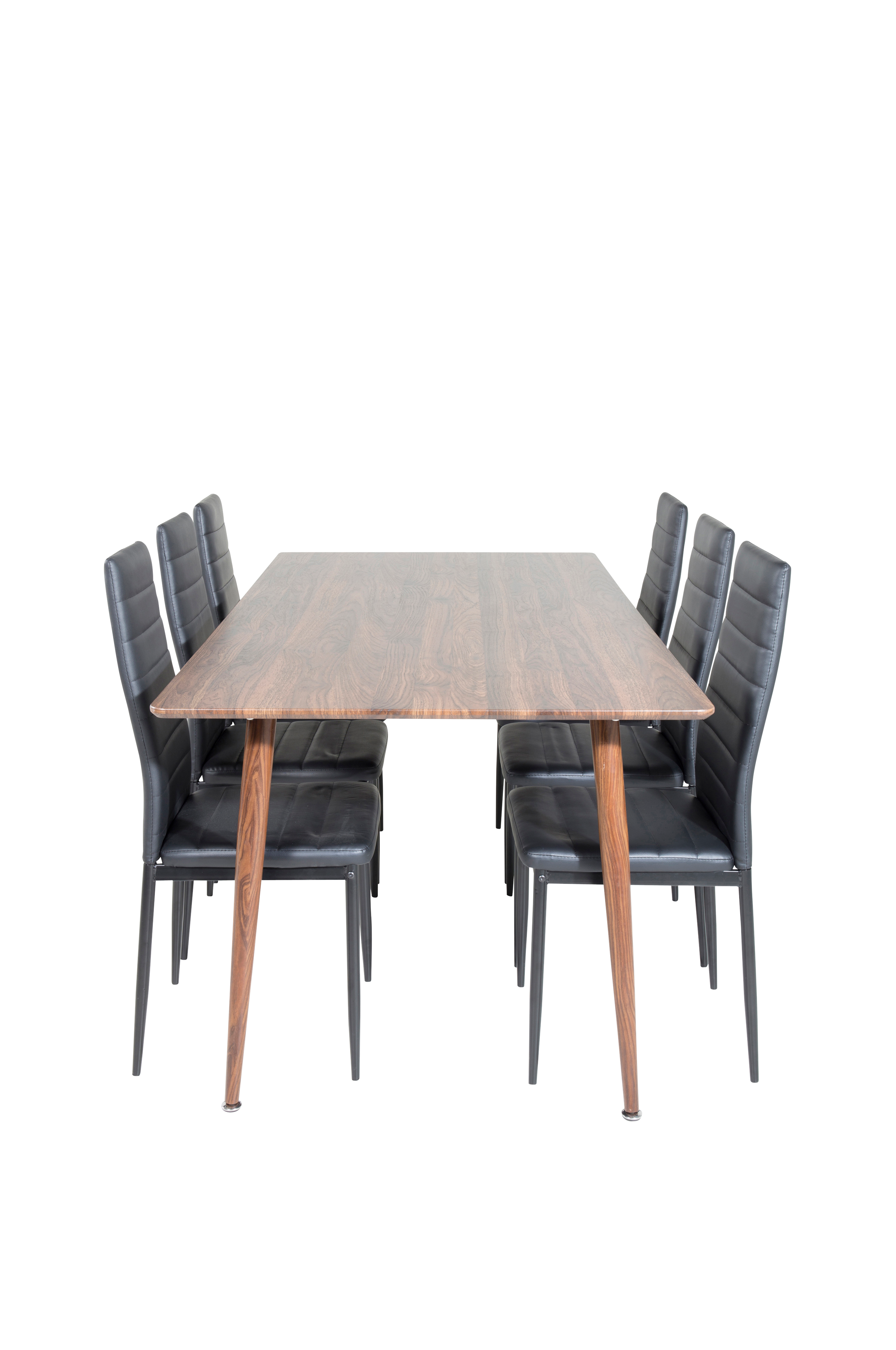 Penally spisebord med bordplate i MDF med valnøttfolie og bordben i metall med valnøttfolie. Matches med 6 Sandviken spisestoler med sete i kunstskinn og stolben i metall. Bord og stol krever enkel montering. Bordets mål: Lengde: 180 cm. Bredde: 90 cm. Høyde: 75 cm. Stolens mål: Sittedybde: 39 cm. Sittebredde: 42 cm. Sittehøyde: 46 cm.