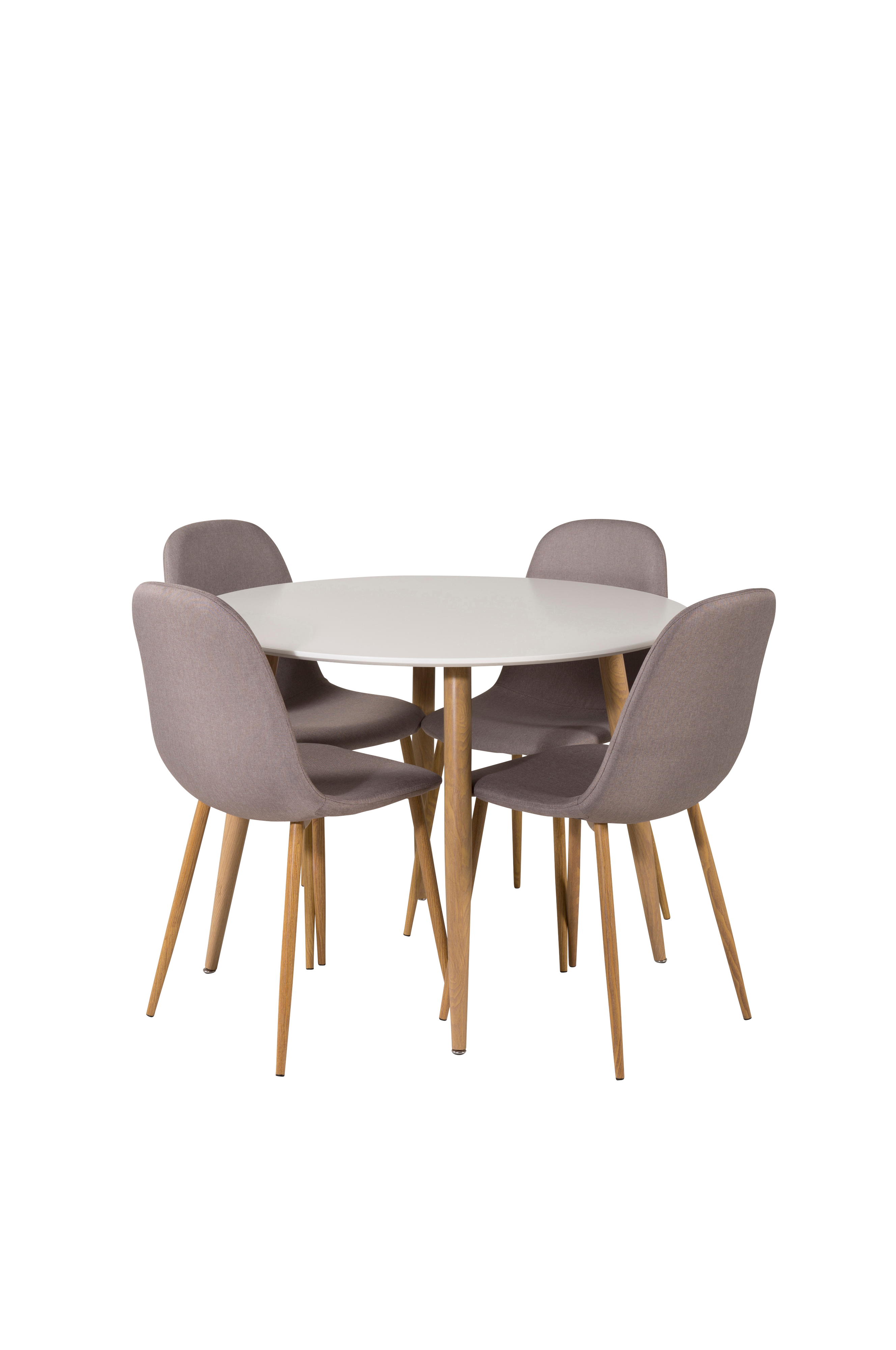 Pia spisebord med rund bordplate i MDF og bordben i metall. Bordets mål: Diameter: 100 cm. Høyde: 75 cm. Matches med 4 Penally spisestoler i polyester med stolben i metall. Mål stol: Totalhøyde: 87 cm. Bredde: 44 cm. Dybde: 53 cm. Sittehøyde: 46 cm. Bord og stol krever enkel montering.