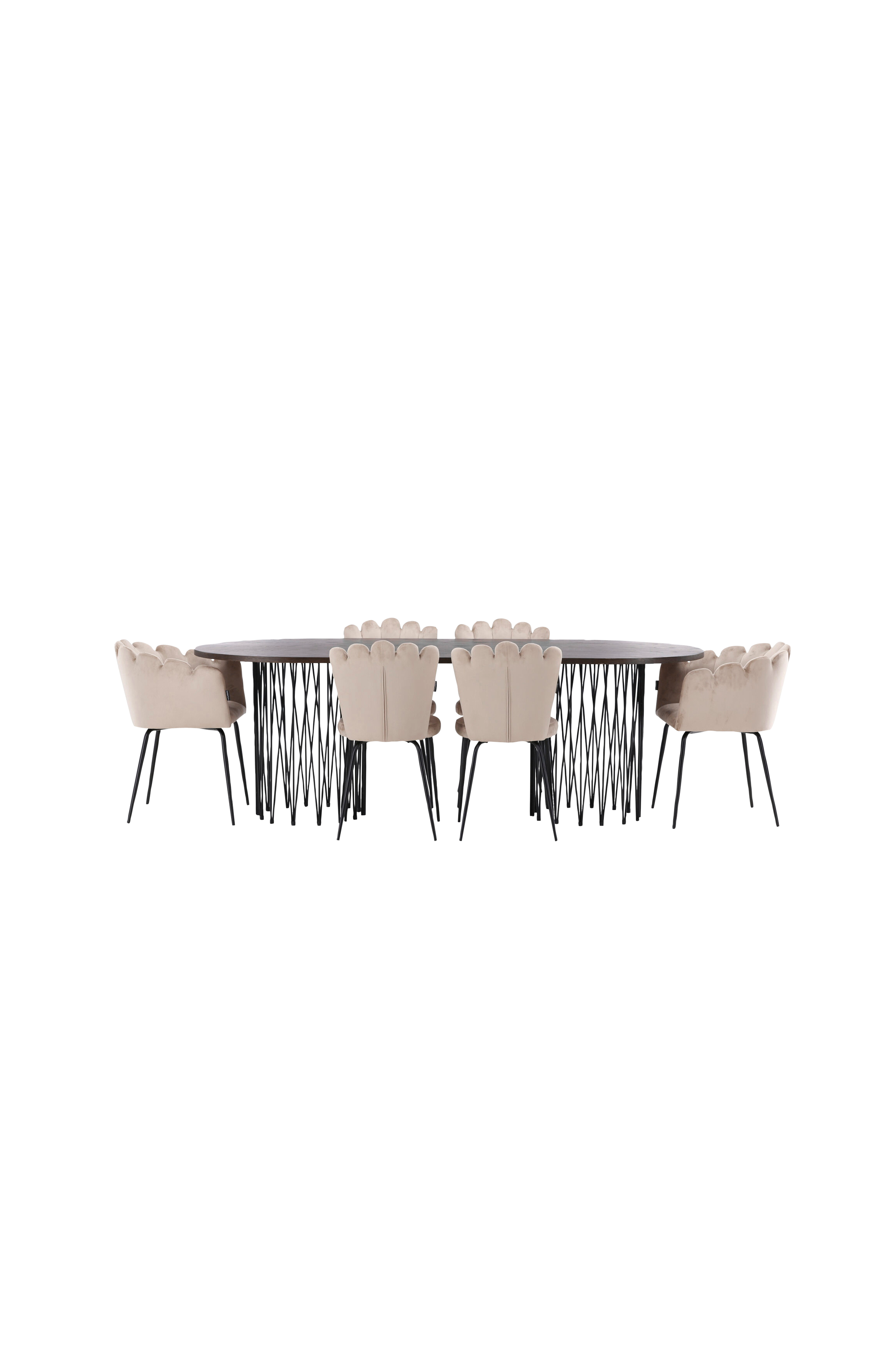Møbler hjemmets hjerte med en spisegruppe som utstråler luksus og komfort! Venture Designs ovale spisebord Stone har en lekker skandinavisk design som mange liker. Bordet har en vakker bordplate i MDF med finér og to dekorative sylinderformede stammer i metall. Her i perfekt kombinasjon med Venture Designs iøynefallende spisestoler fra serien Limhamn. Stolen er en moderne favoritt i mange hjem med sin innbydende design, dekorative skjellformede rygg med dekorsømmer og runde sete i smakfullt fløyelsstoff. Bena er i pulverlakkert metall. Sitt komfortabelt og flott!