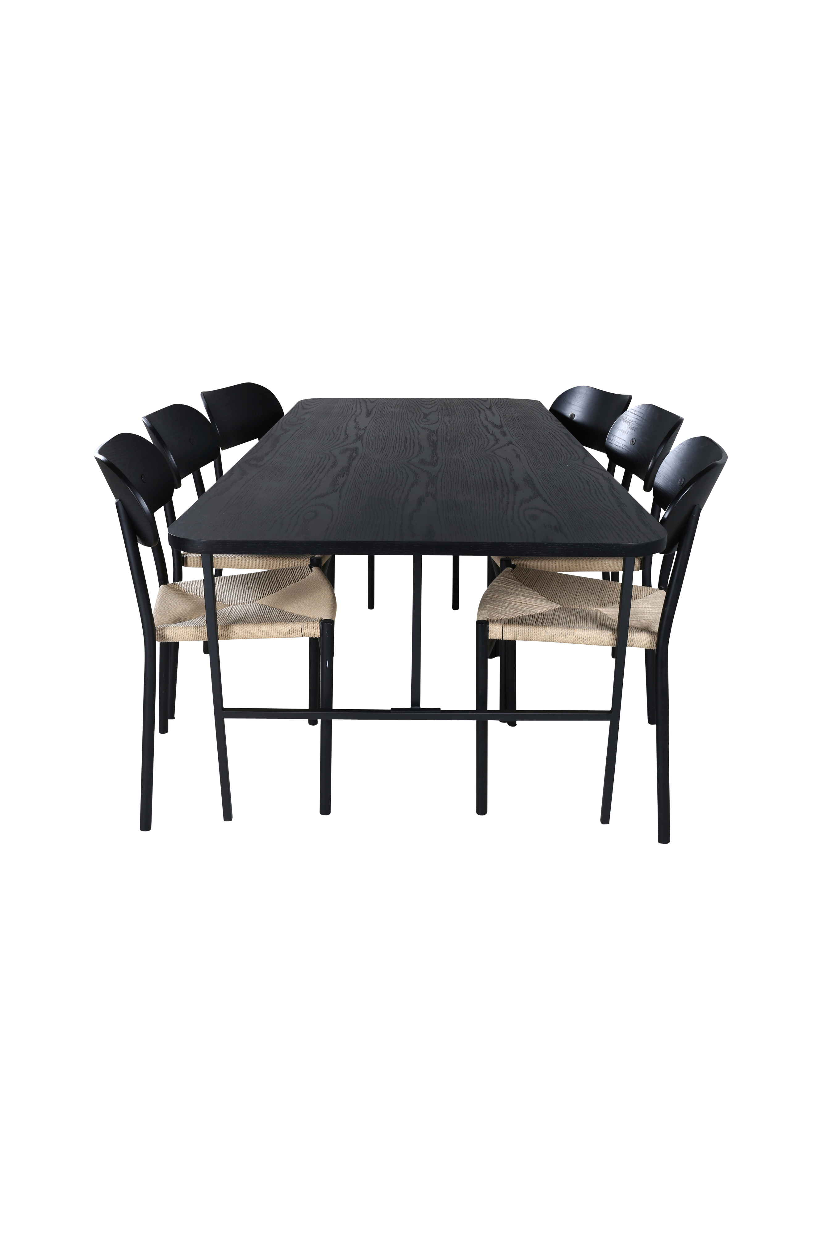 Uno spisebord med bordplate i MDF med finér og bordben i jern. Matches med 6 Polly spisestoler med sete i tau og ben i metall. Bord og stol krever enkel montering. Bordets mål: Lengde: 200 cm. Bredde: 90 cm. Høyde: 74 cm. Stolens mål: Sittedybde: 51,5 cm. Sittebredde: 49 cm. Sittehøyde: 47 cm.