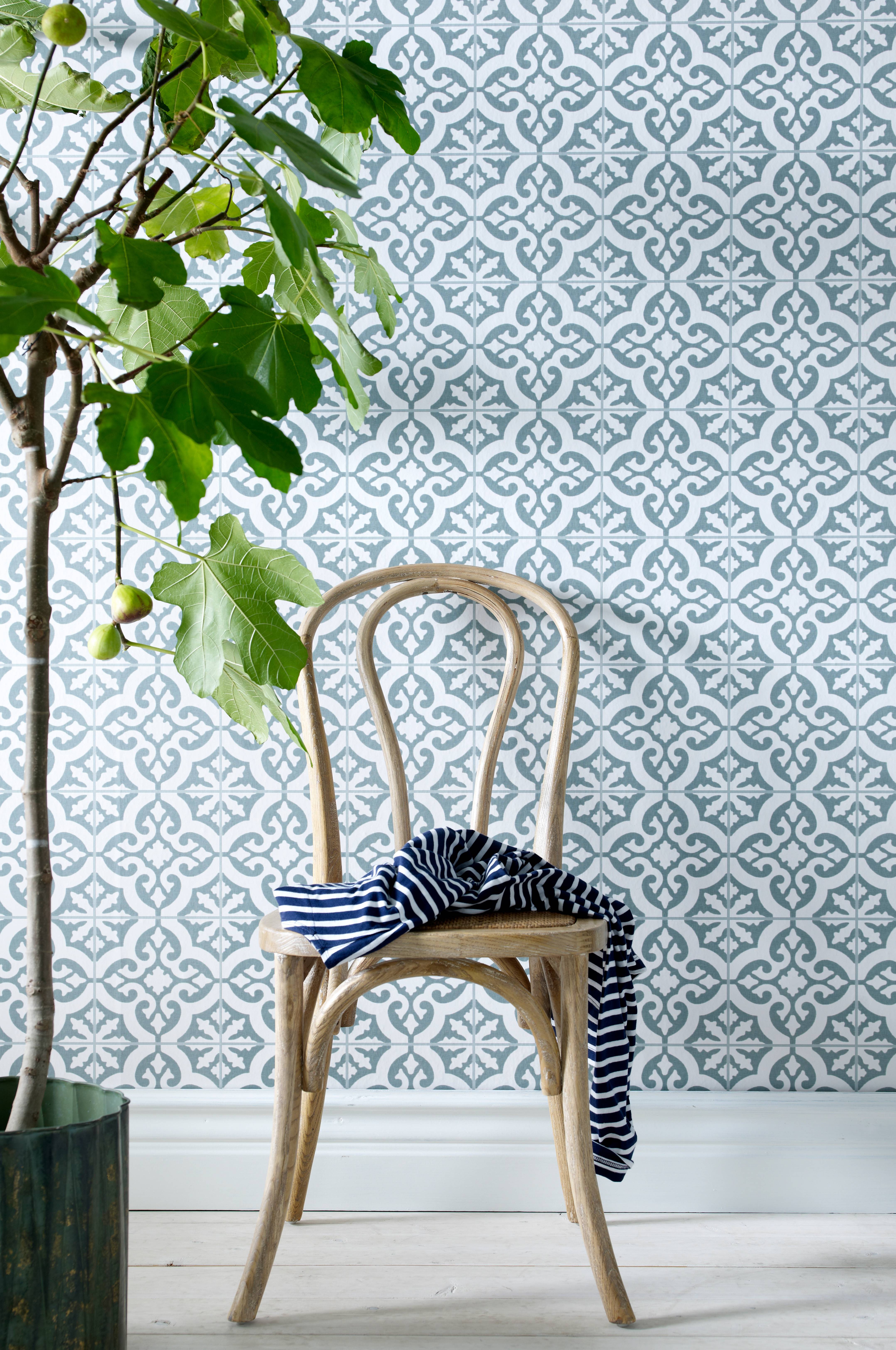 Pynt hele kjøkkenet mitt, som marokkanske fliser. Elsker det. Fargen føles litt mer blå/grå