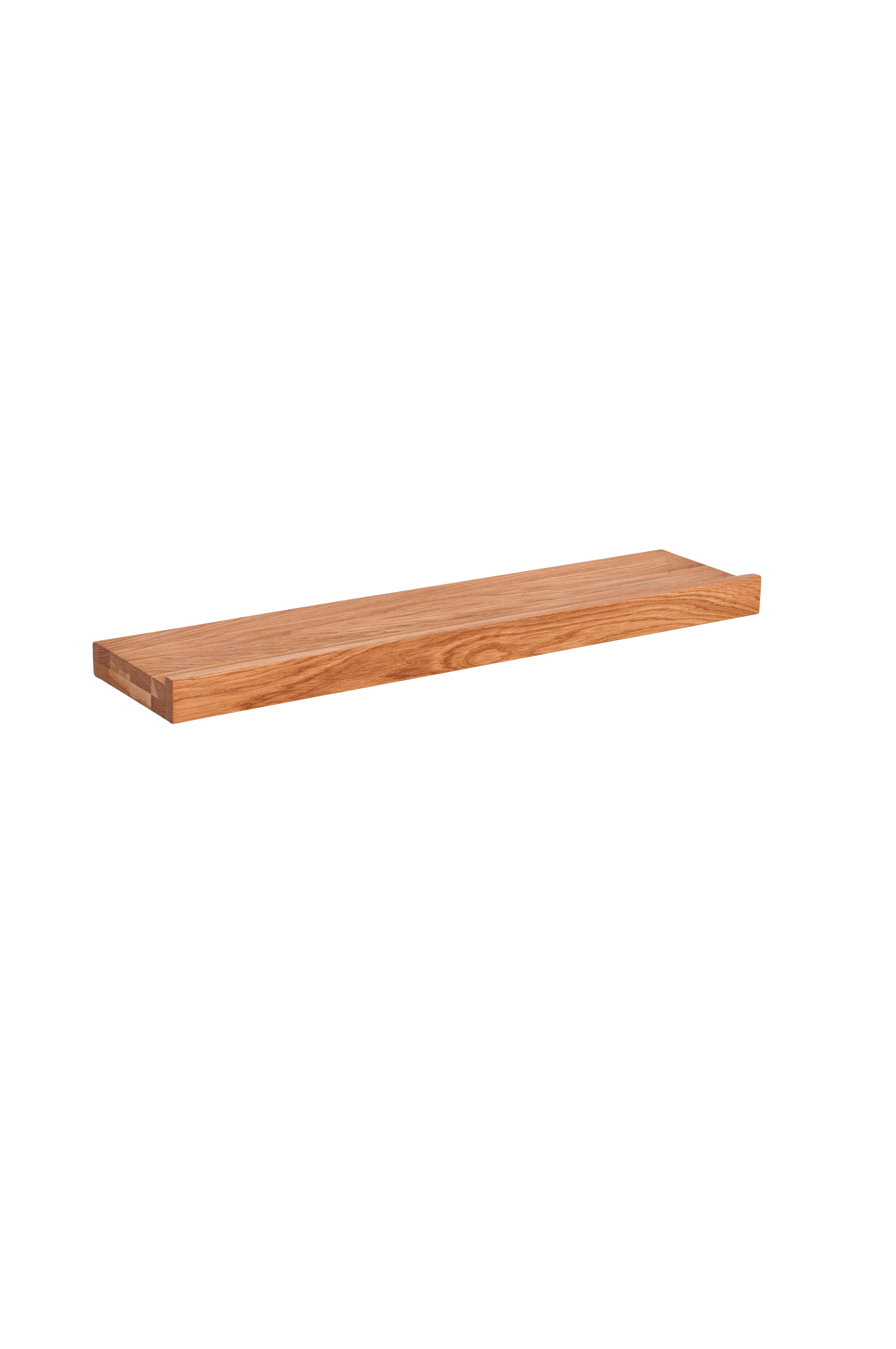 Enkel og allsidig design som passer alle interiørstiler. Finnes i 3 ulike lengder. Hyllene kan kombineres for å skape din egen unike interiørstil. Opphøyd kant på den ene siden. Kanten gjør at bøker, kunst- og pyntegjenstander holdes på plass og ikke detter ned. Hyllen av eik er oljet for å fremheve den naturlige fargen. Det er naturlig at ingen produkter har nøyaktig samme fibermønster, farge, finish eller kvistmerker. Veggfestene er skjulte.