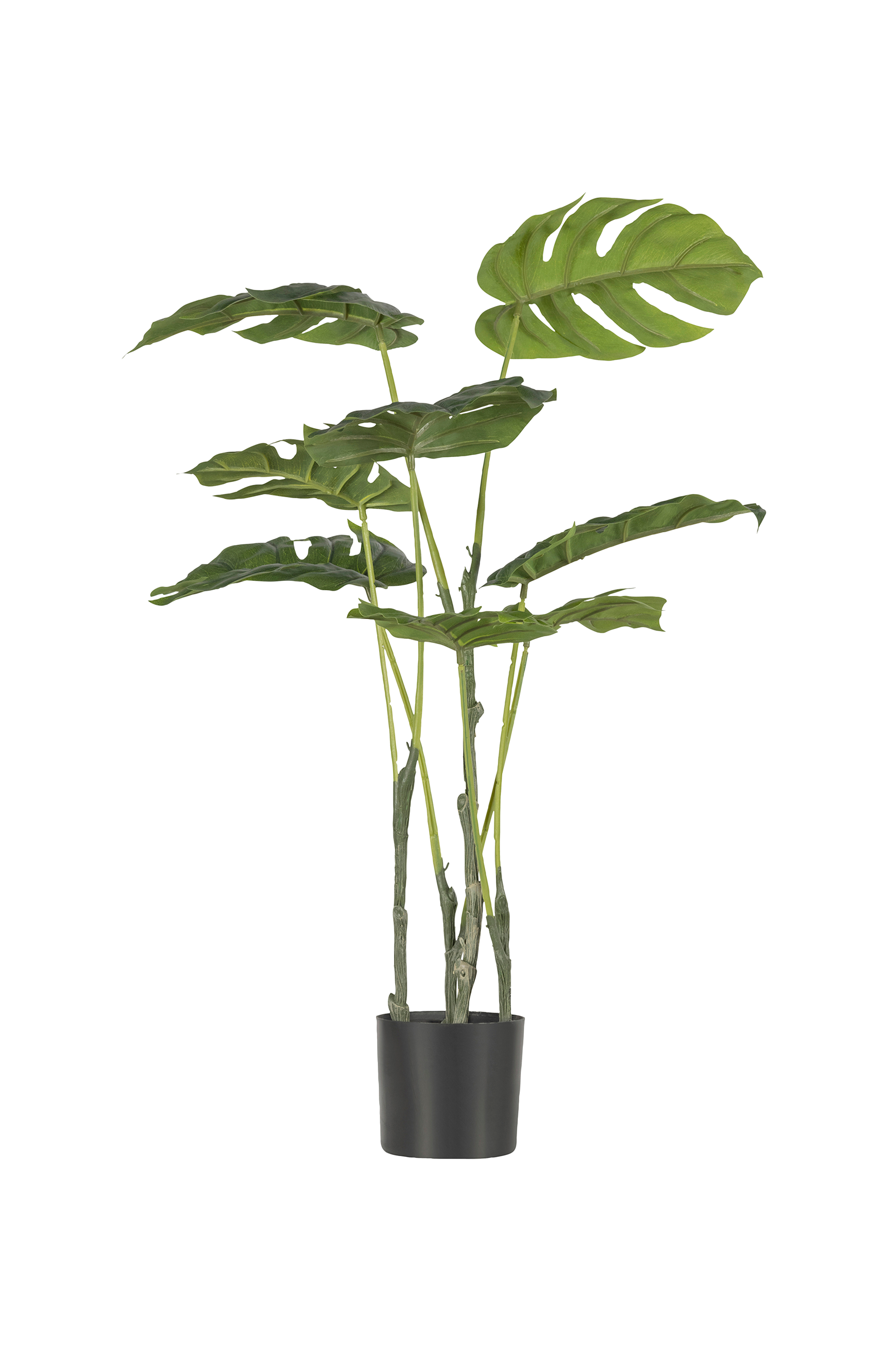 Den kunstige planten Monstera har en høyde på 76 cm, og er fullt utvidet 66 cm bred og 57 cm dyp. Den svarte potten av syntetisk materiale inneholder skumplast og betong som gir riktig tyngde. Potten har en høyde på 12 cm og diameter 12 cm. Den kunstige planten Monstera veier 1,5 kg.