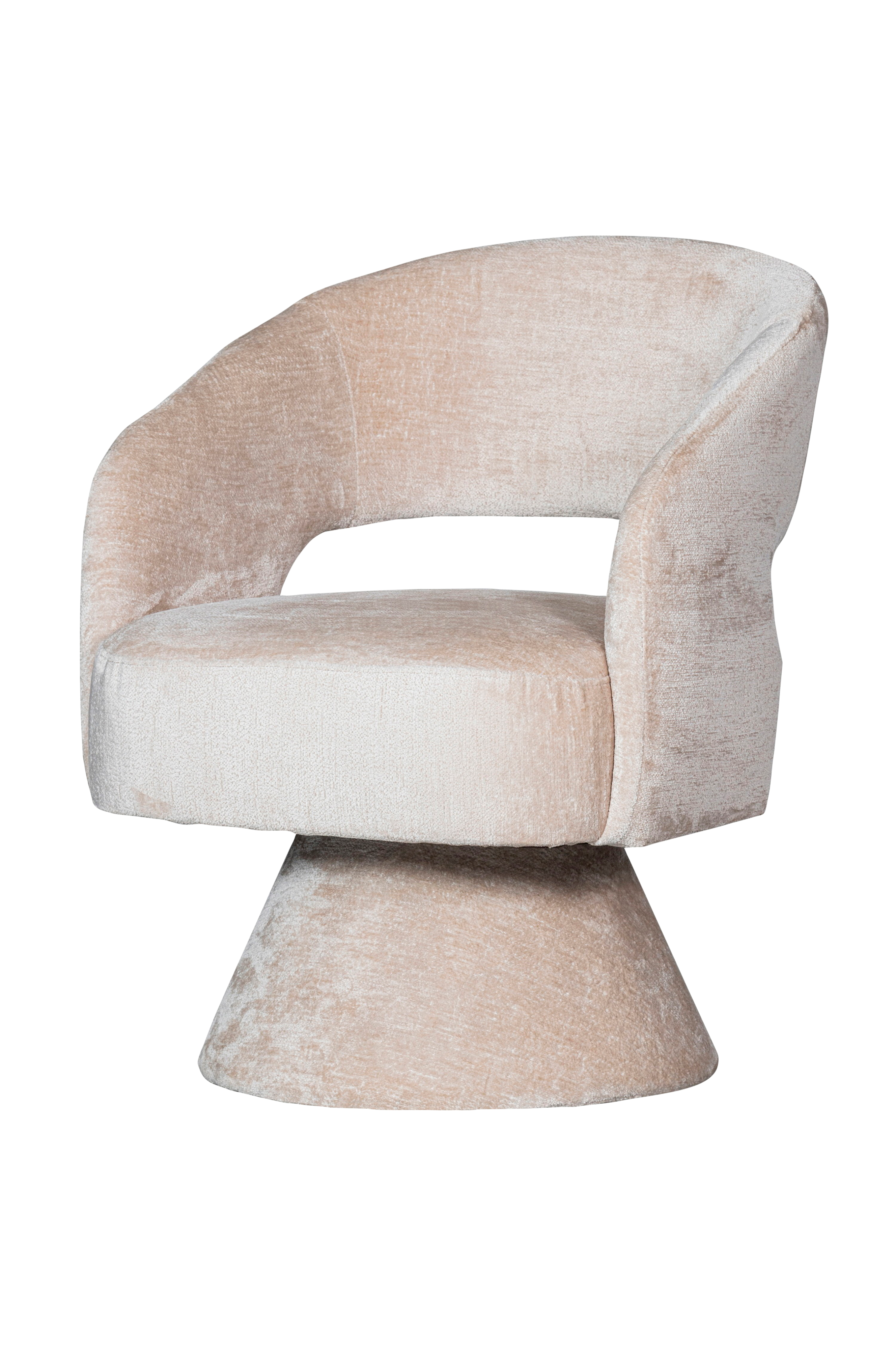 ebba svingbar lenestol fra kolleksjonen til det nederlandske merket woood har et elegant utseende og myke former. Ebbas sete, rygg og understell er trukket i et mykt chenillestoff. Ebba inviterer deg til å slappe av!