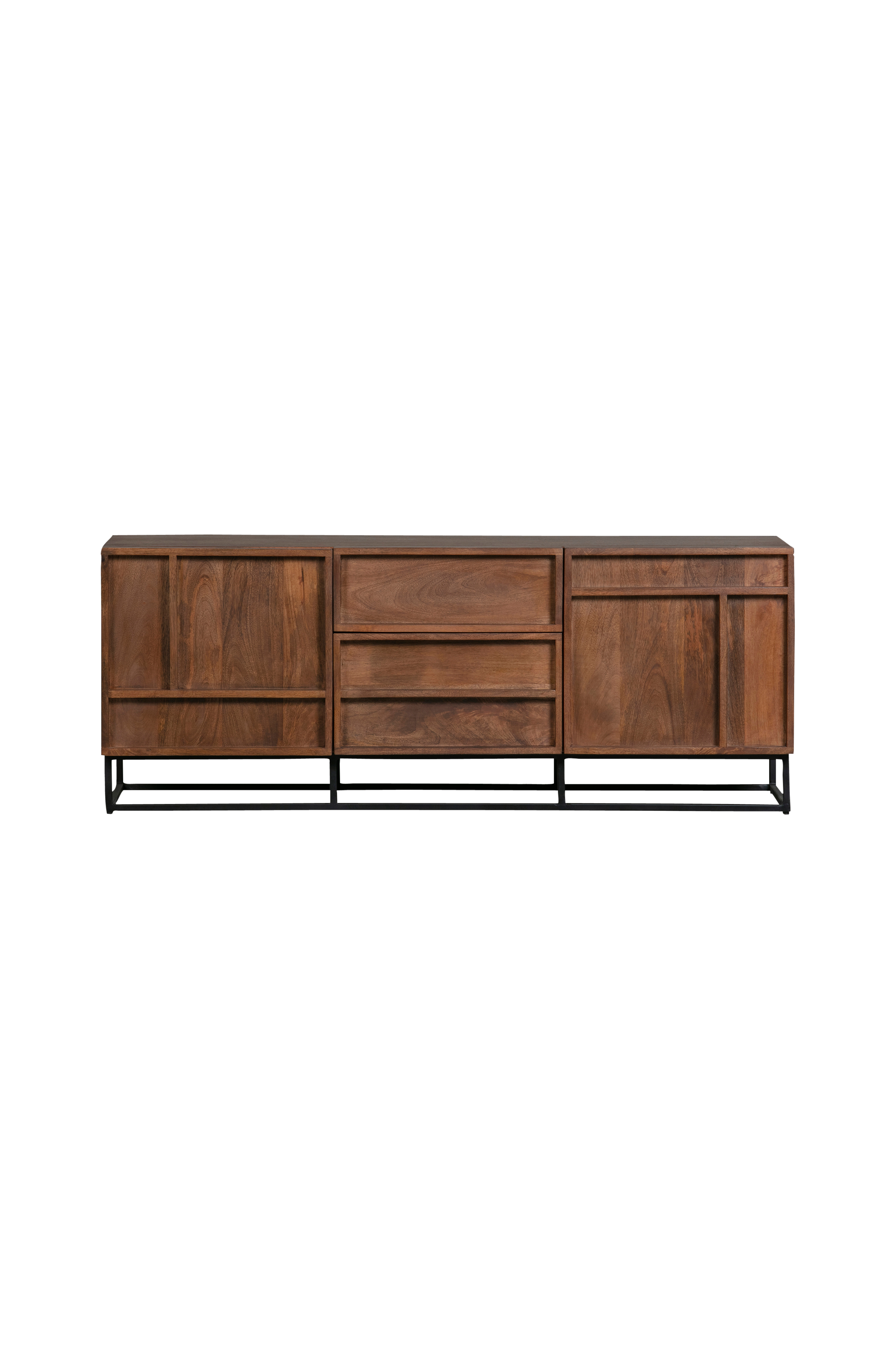 Mediebenken har 2 skuffer og 2 dører. Skuffene åpnes enkelt med skuffestyring. Den øverste skuffen har følgende mål (hxbxd): 10,5x39,5x30 cm, og den underste skuffen (hxbxd): 18,5x39,5x30 cm. Skuffer og dører er lette å åpne fordi det er håndtak i øvre kant av rammen. Bak hver dør er det en hylle som skaper to oppbevaringsrom. Høyden på disse rommene er 18,5 cm, bredde 44,5 cm, dybde 35,5 cm. Ben i metall som er 12,5 cm høye.