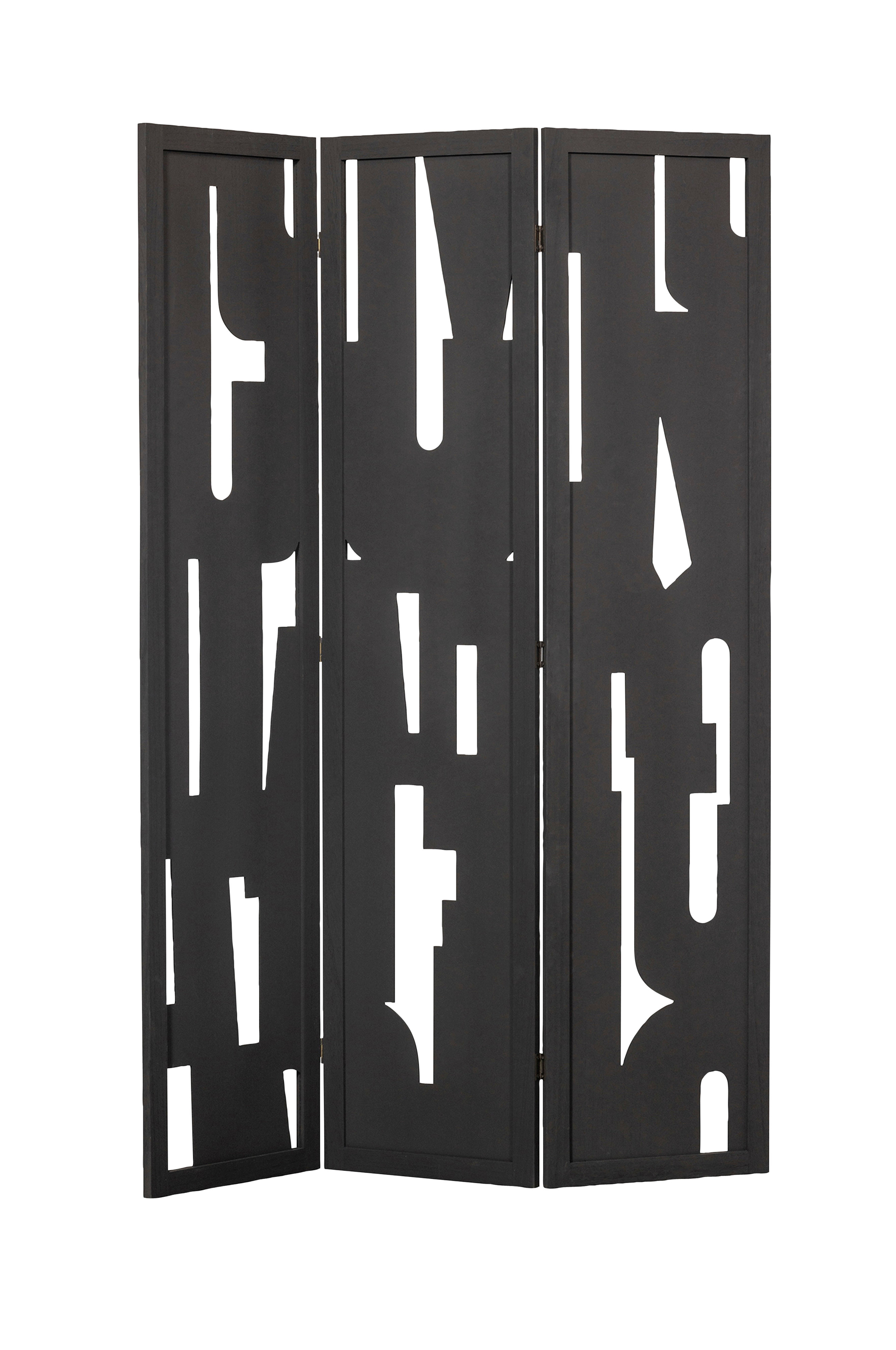 Romdeler Merel, fra det nederlandske interiørmerket WOOOD, gir en elegant løsning for å subtilt dele opp eller skjule boflater. Skjermveggen er produsert av slipt mangotre med mattsvart finish. De tre panelenes grafiske mønster skaper en fin, dyp effekt og gir fin avdeling.