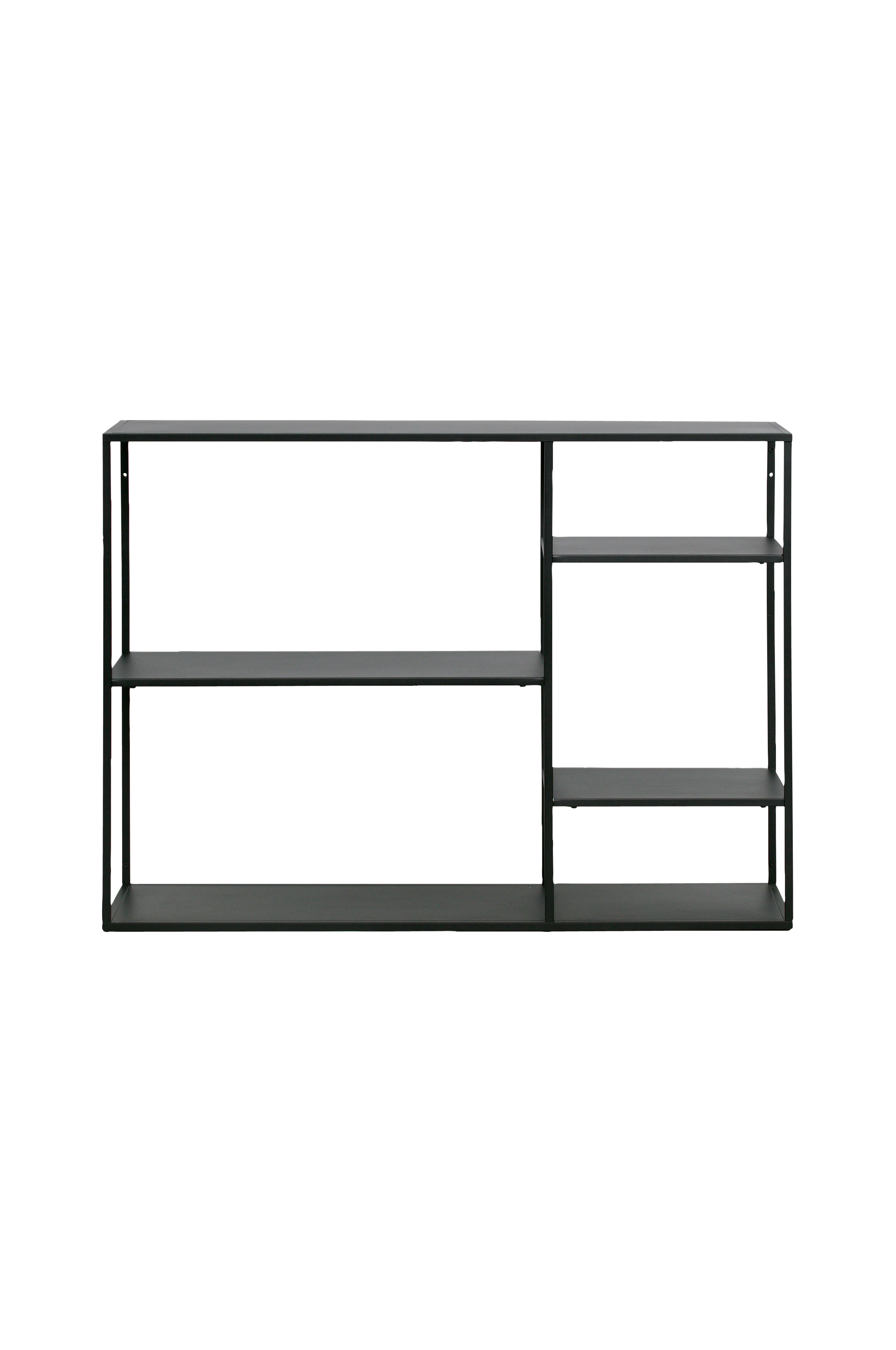 Sidebord med mål (HxBxD) 87,5x120x35 cm. Produsert i en rørformet stålramme på 15x15 mm, lakkert, kombinert med tre lakkerte hyller (0,7 cm tykke). Høyden mellom rommene er 41,5 cm, og høyden på de to små rommene er 19,5 cm. Bredden på de store rommene er 75 cm og 40 cm på de smale rommene.