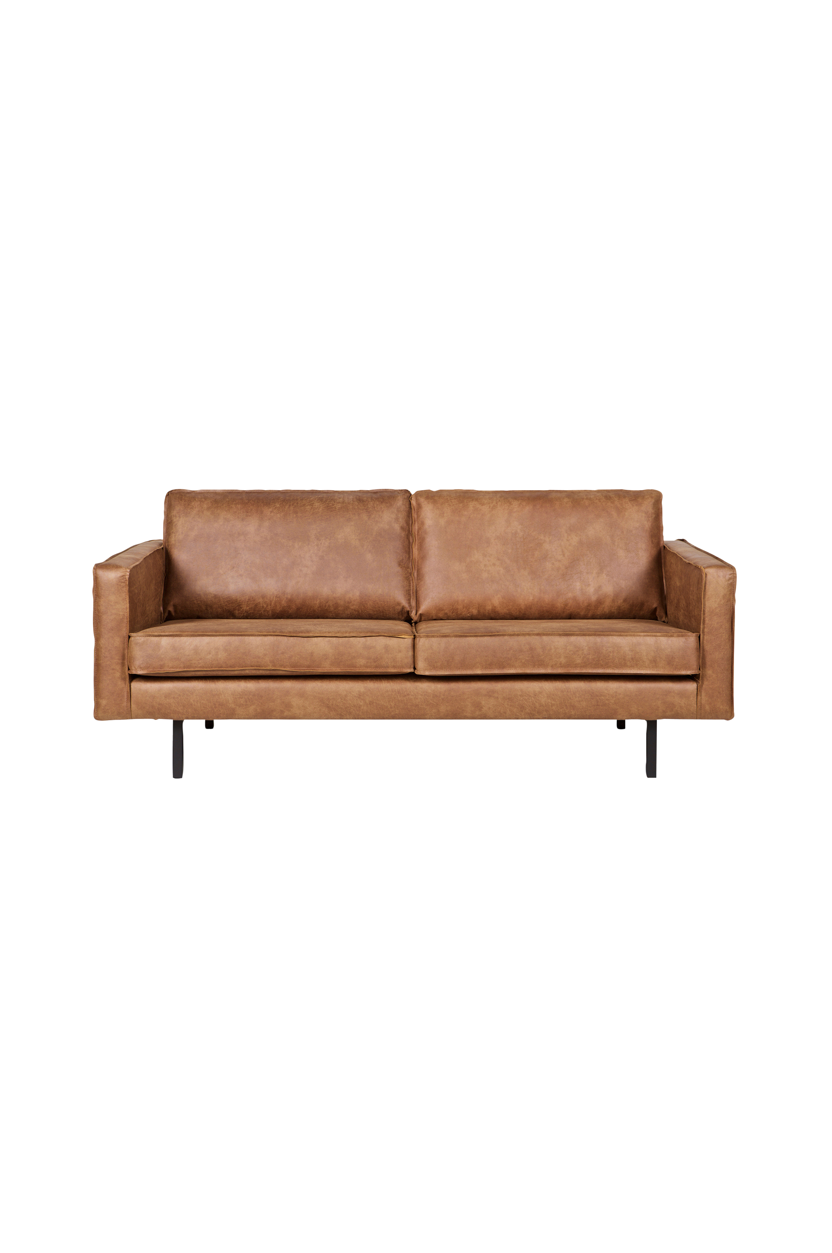 Denne 2,5 seter sofaen er sjenerøs, har god sitteplass og et robust stoff i resirkulert skinn. De løse putene er ikke vendbare. Bena er av metall. Setehøyde 45 cm, sittedybde 60 cm, sittebredde 166 cm, rygghøyde 49 cm. Armlener bredde 12 cm, høyde 68 cm.