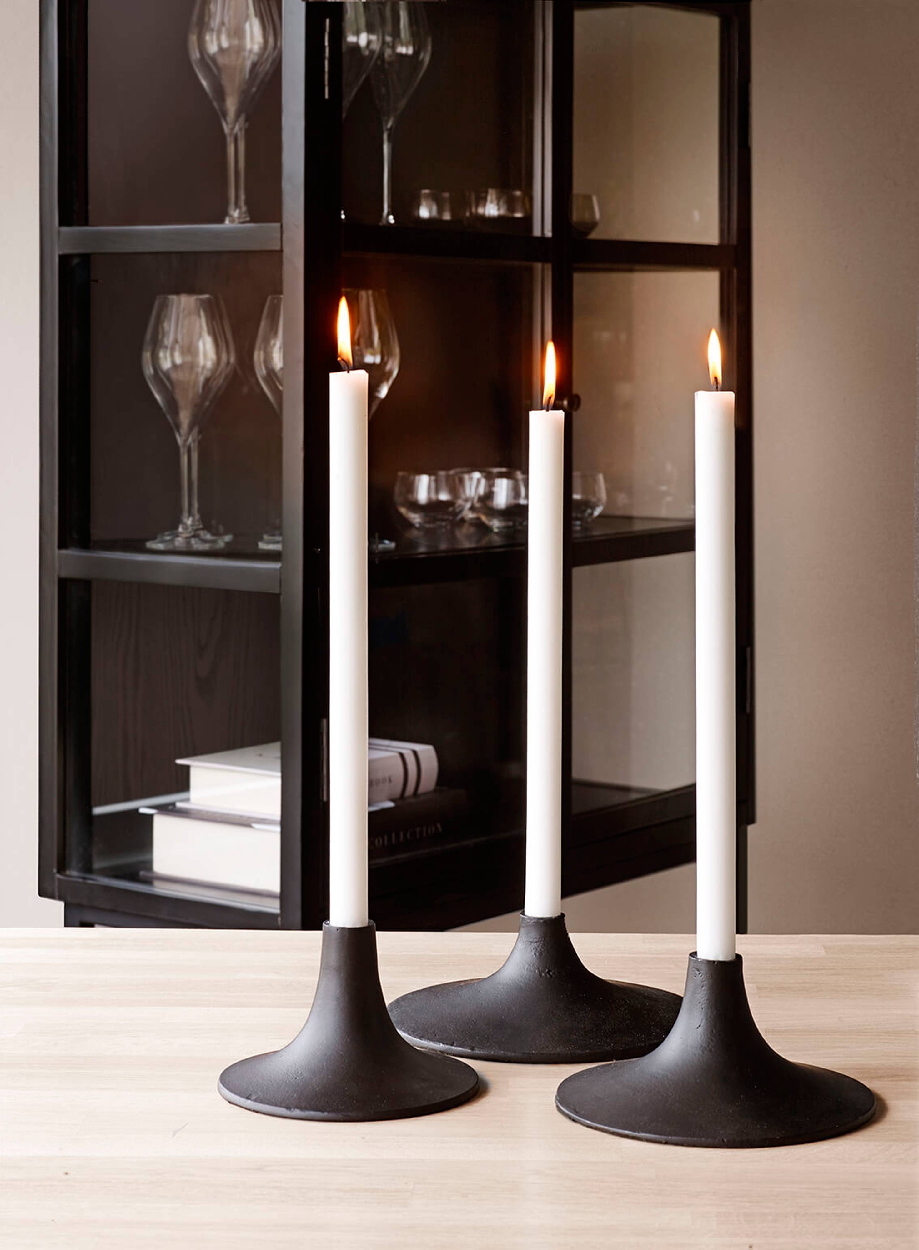 Runde bordlysestaker for kronelys i lav modell produsert i rå aluminium med matt finish.