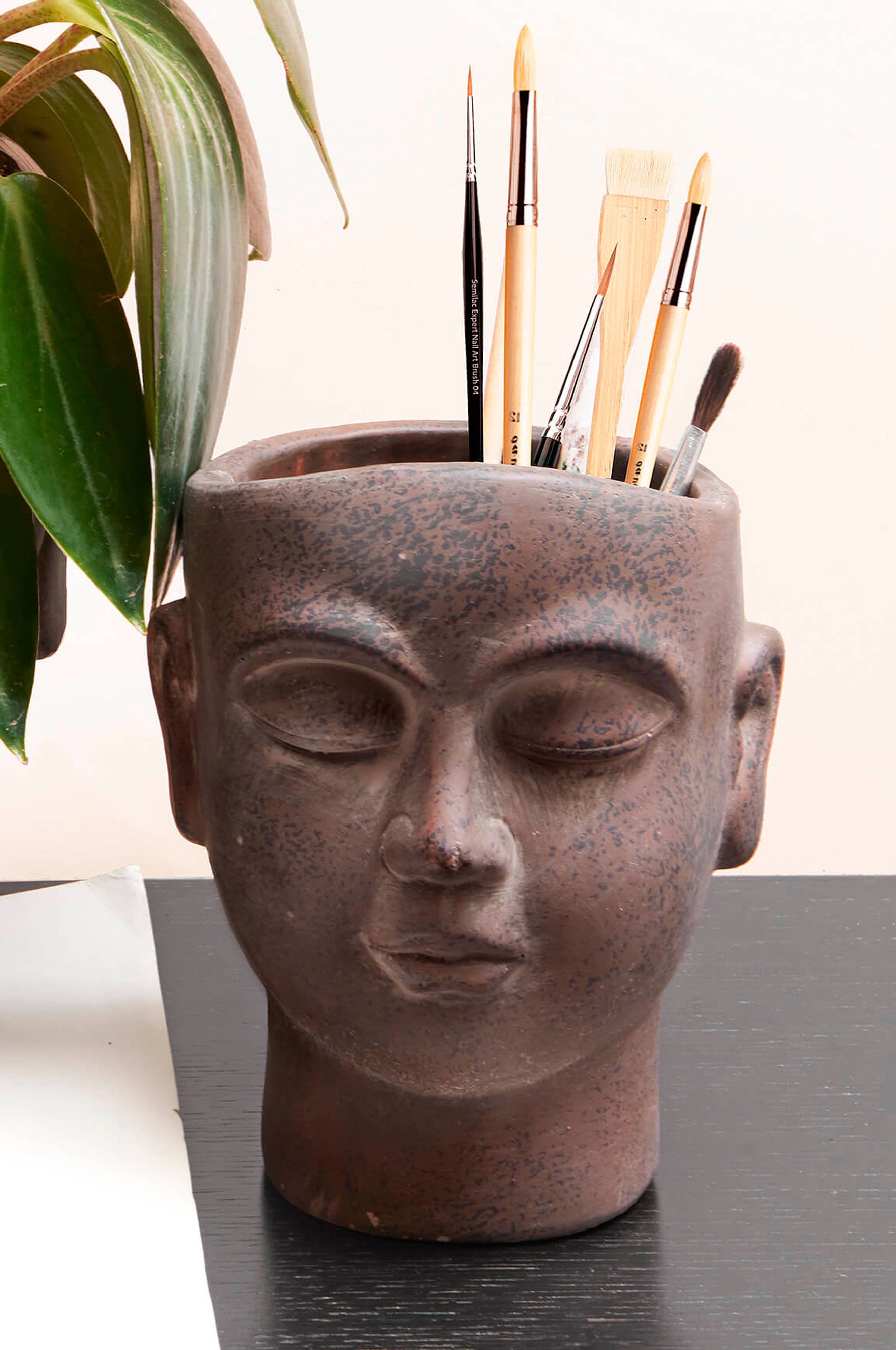 Krukke formet som et ansikt. Antikk look i skiftende farge.