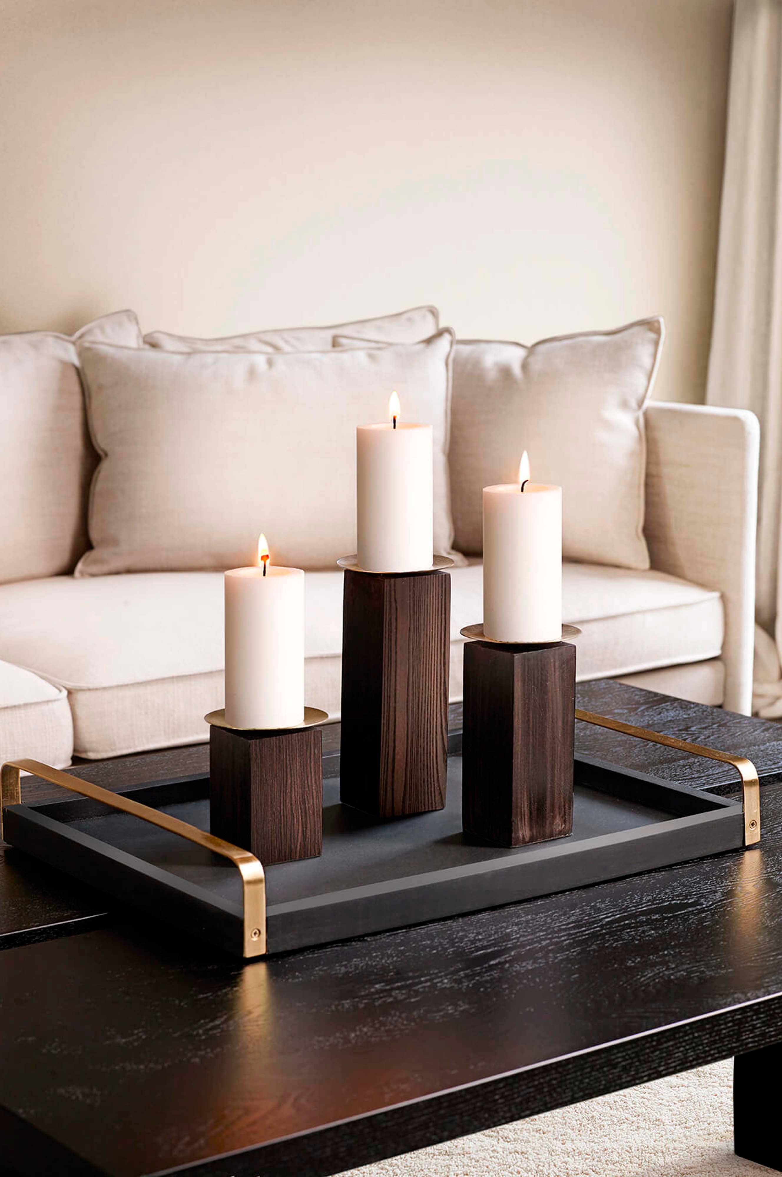Stort og stilig matt svart trebrett med gullhåndtak og messingdekor the Z Collection. Anvendelig både som brett og dekor på sofabordet, B40, L55, H7 cm
