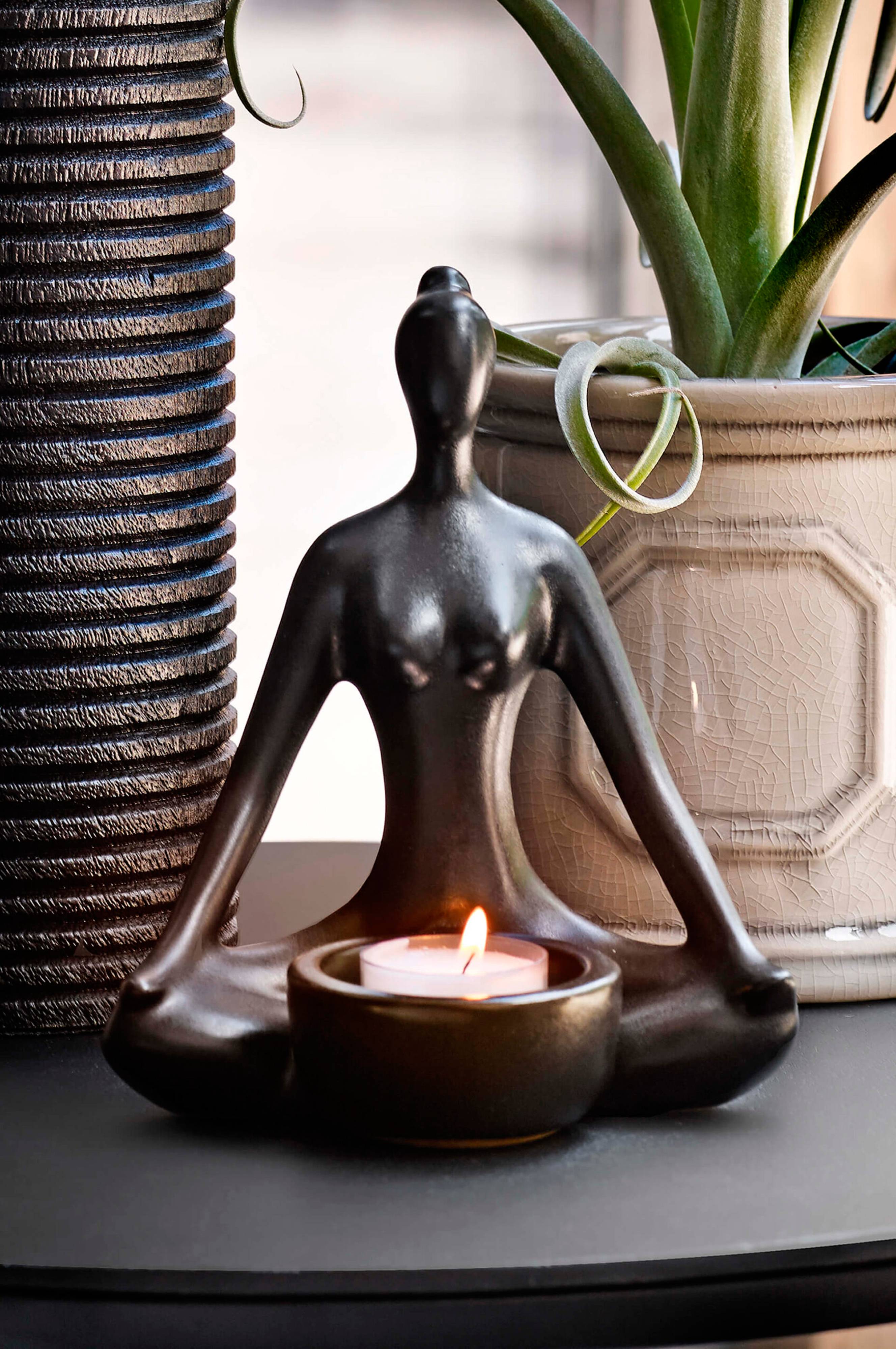 Telysholder formet som silhuetten av en yoga-kvinne. Plasser flere stykker ved siden av hverandre eller vakkert alene. Glasert, matt keramikk.
