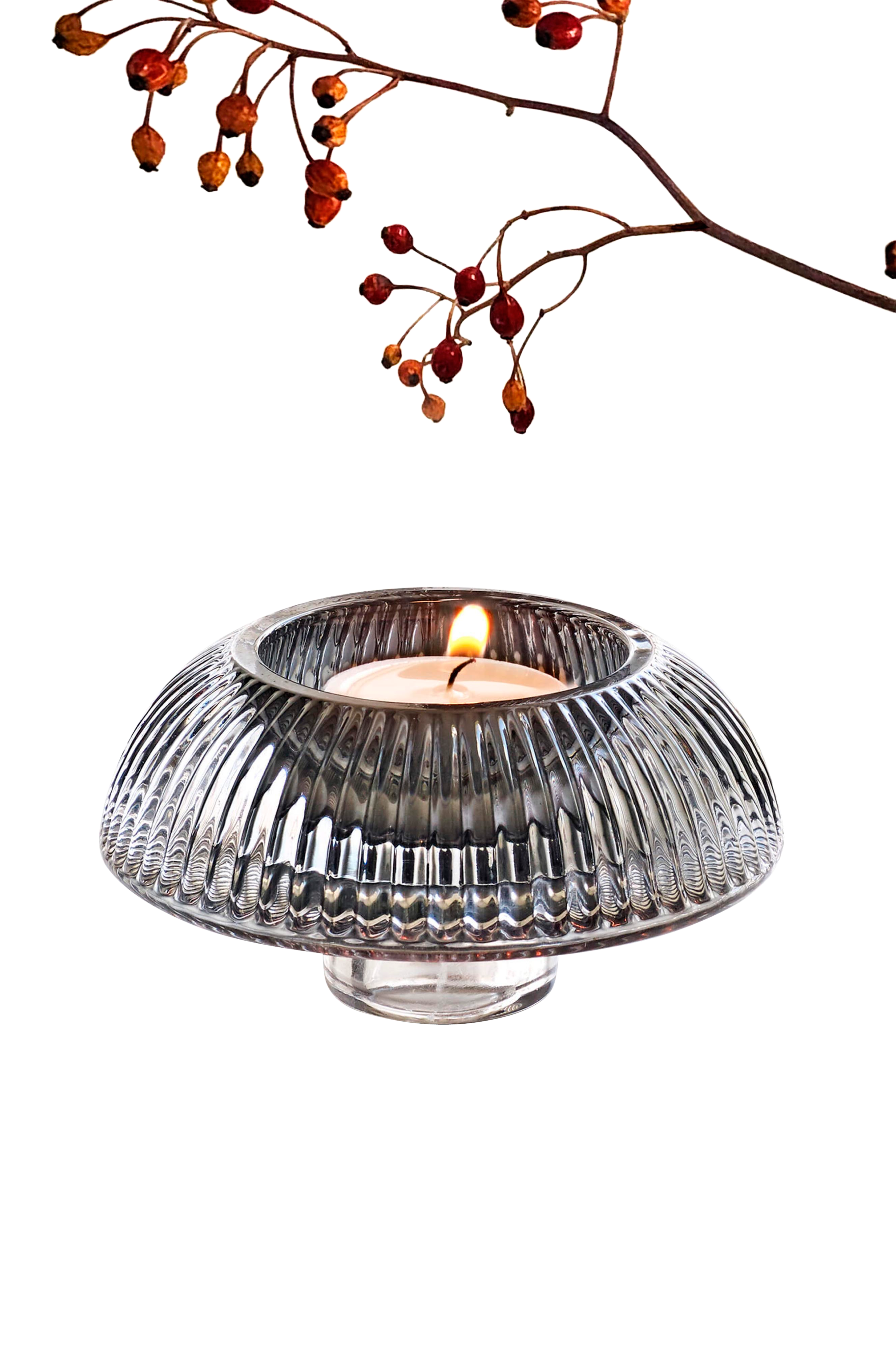 Lysestake i farget, riflet glass. Vendbar til både kronelys og telys. Matcher fint med vasen Mojave.