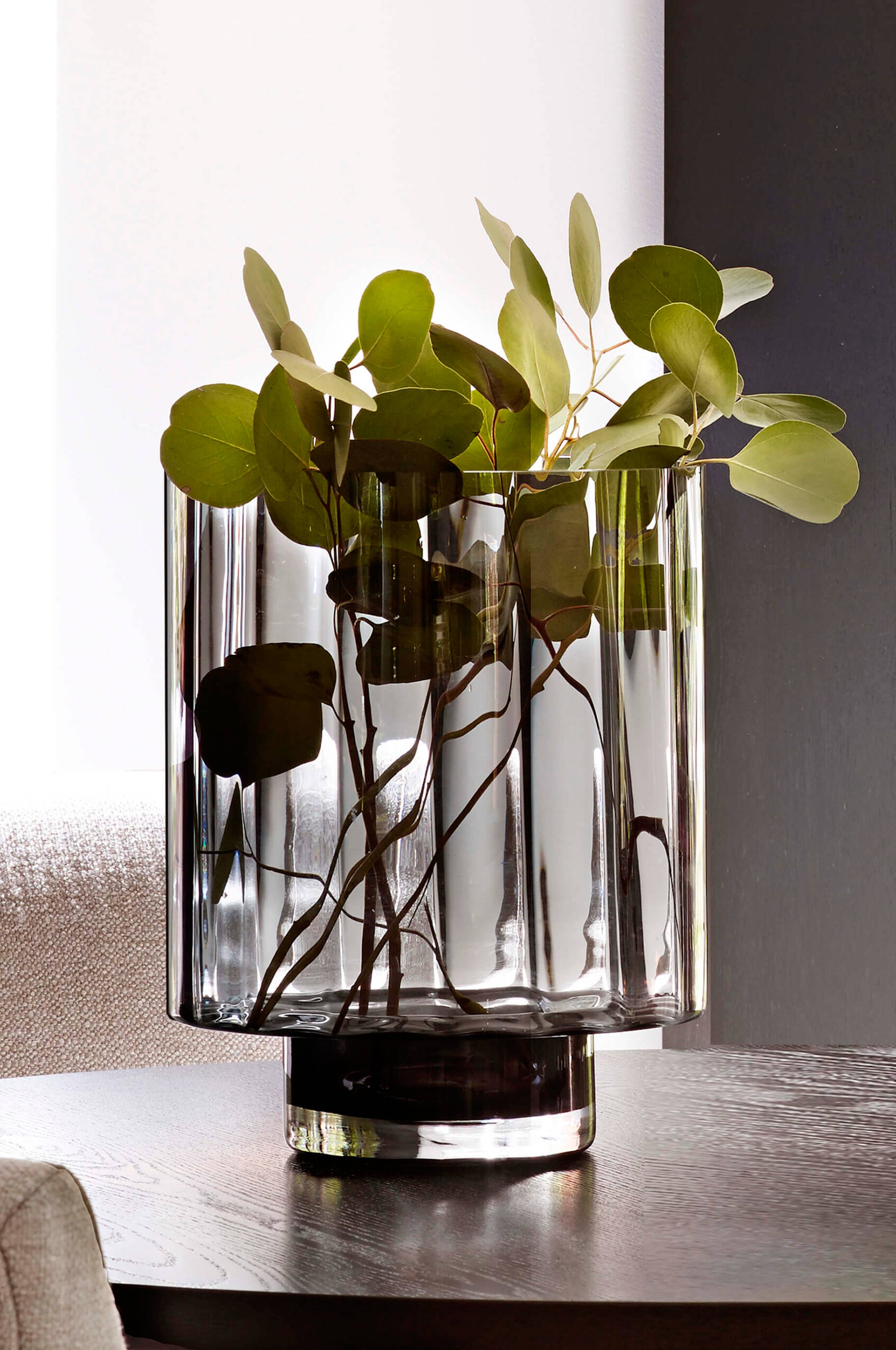 Stor og praktfull håndlaget vase i bølget, røykfarget glass. En vase som kan brukes både som lykt og vase. Match vakkert til lykten Optic. Høyde 35 cm, Ø 27,5 cm.